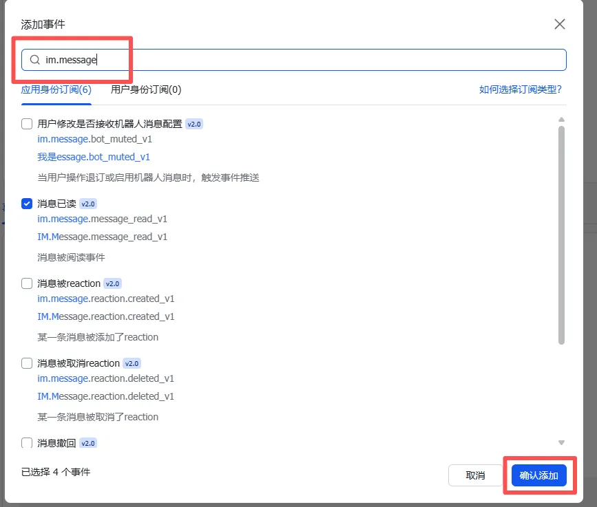 通过搜索框输入 im.message 查询,勾选后点击「确认添加」。