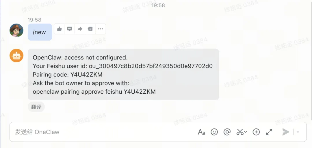 机器人发布成功后,在飞书中给机器人发一条消息,OneClaw 会弹出配对请求提示。