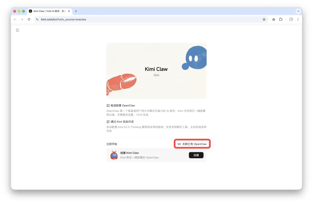 在浏览器打开的 Kimi Claw 页面中,找到「立即开始」区域,点击右侧的「关联已有 OpenClaw」按钮。
