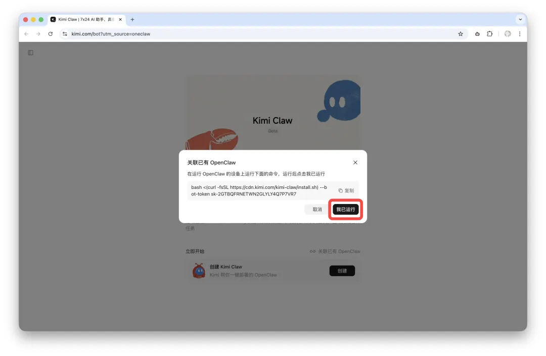 回到浏览器中的 Kimi Claw 对话框,点击「我已运行」按钮完成关联。