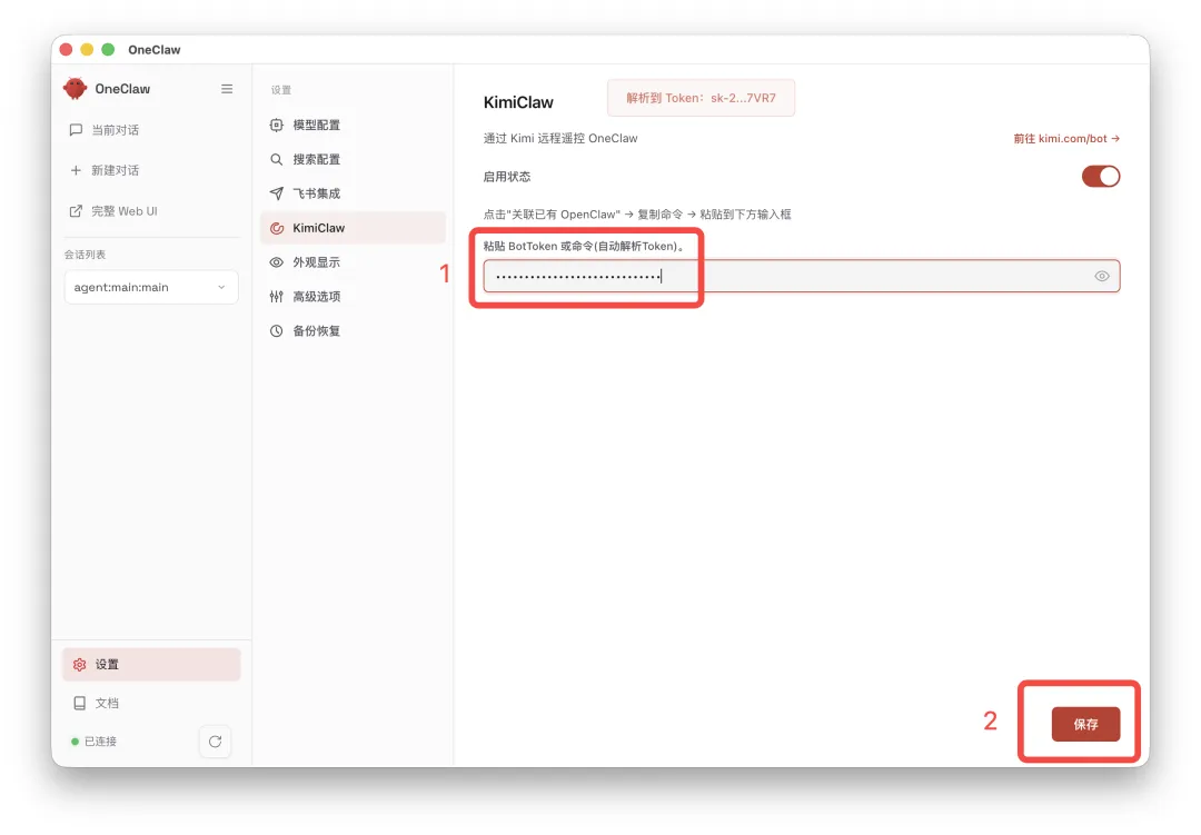 回到 OneClaw 的 KimiClaw 设置页面,打开「启用状态」开关。