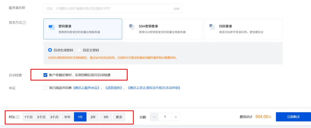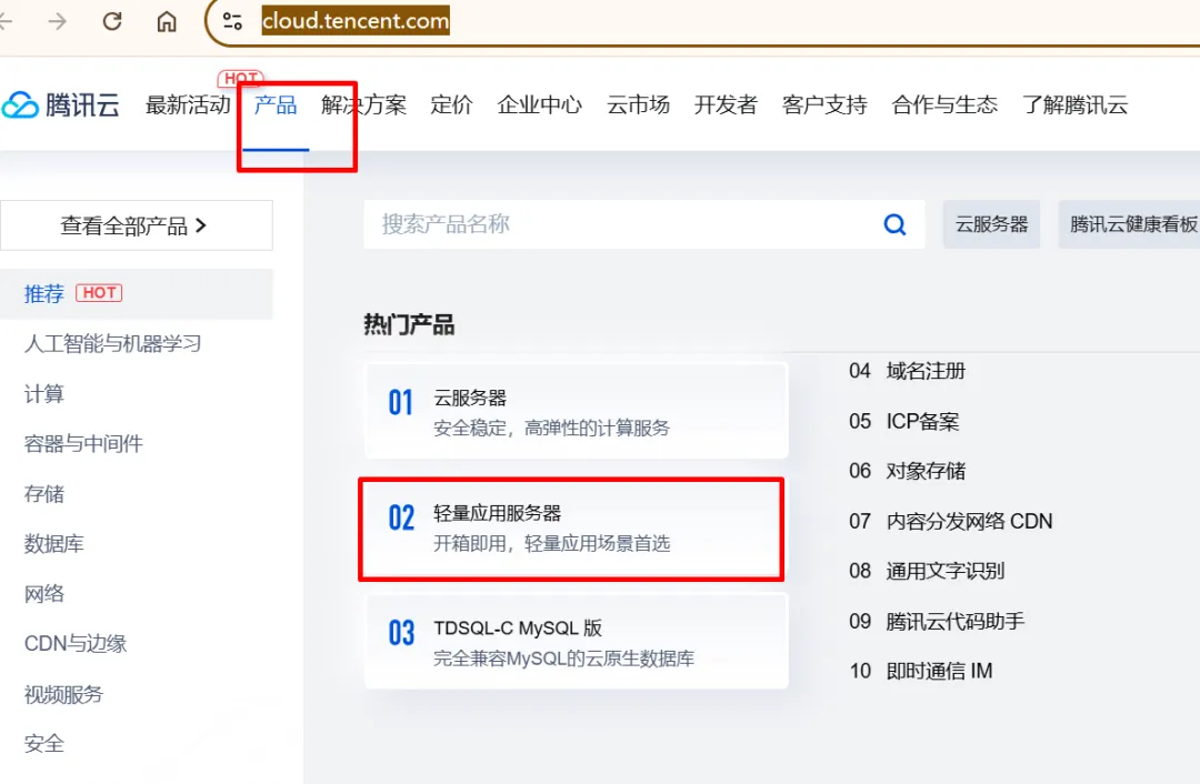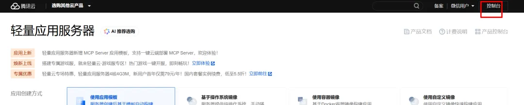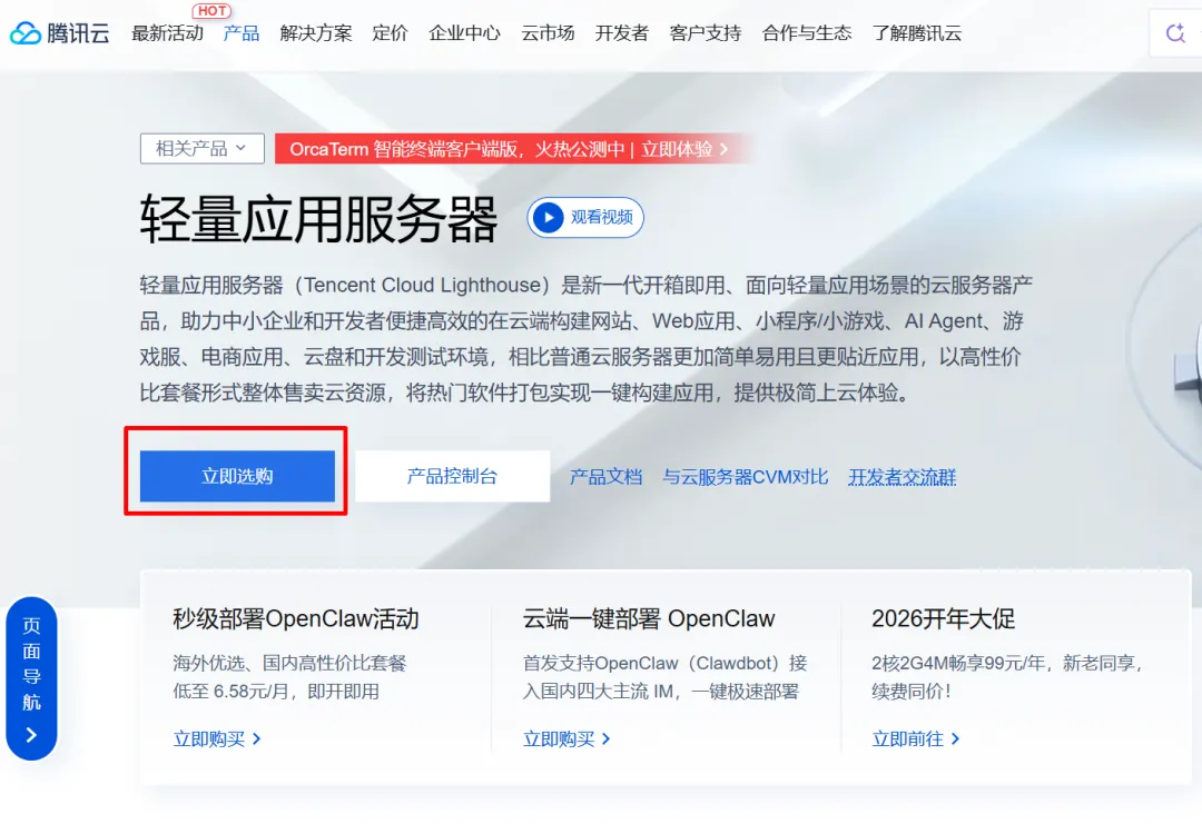 微信扫码登录后,点击“产品”,选择“轻量应用服务器”,点击“立即选购”进入购买页面。
