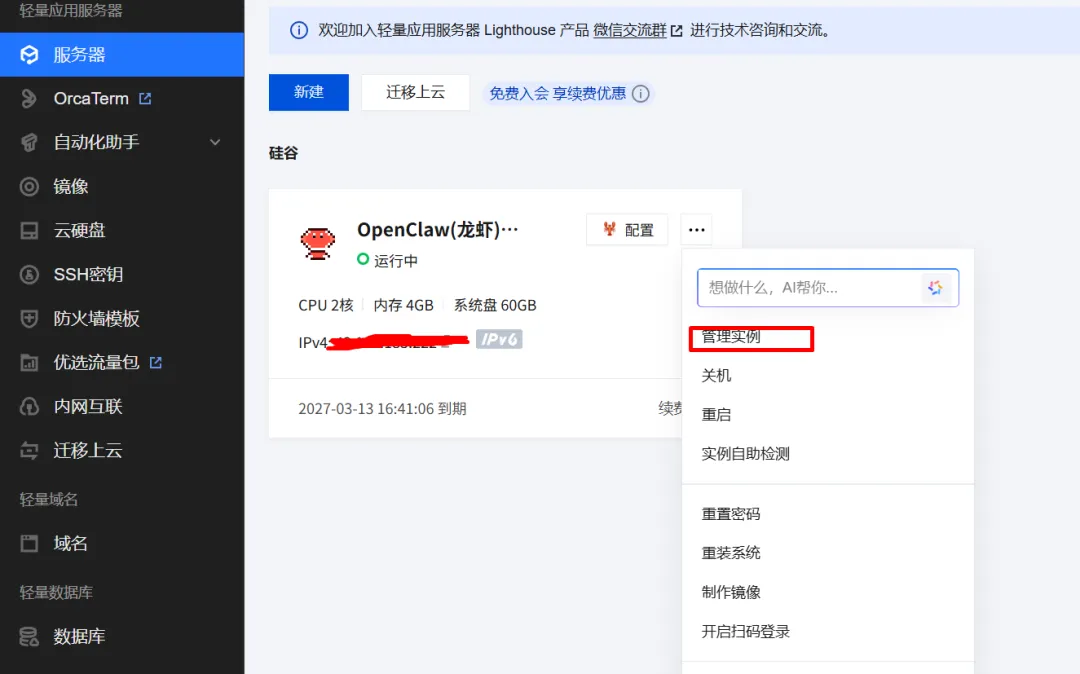 在腾讯云控制台找到你的服务器实例,进入应用管理页面。