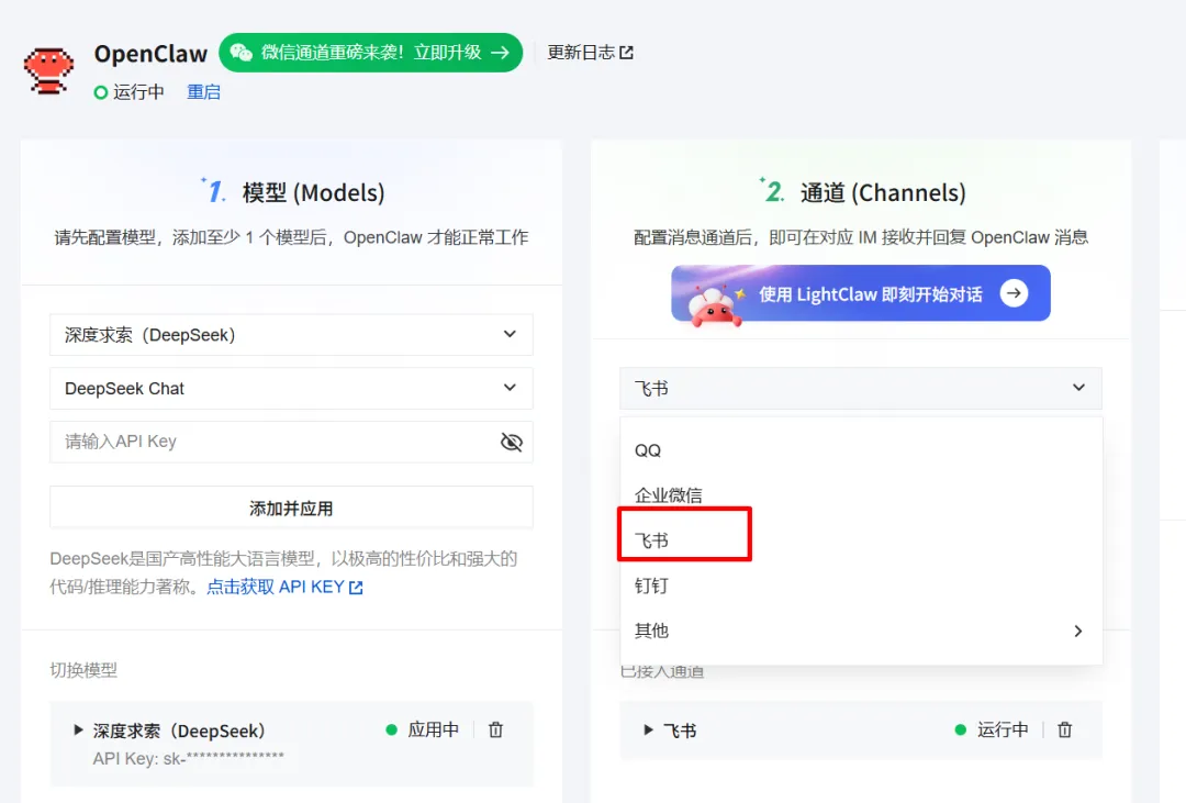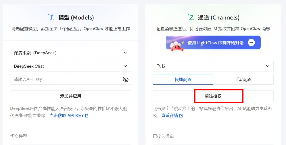 接入飞书有两种方式,推荐用“快捷配置”,只需要扫码就行。