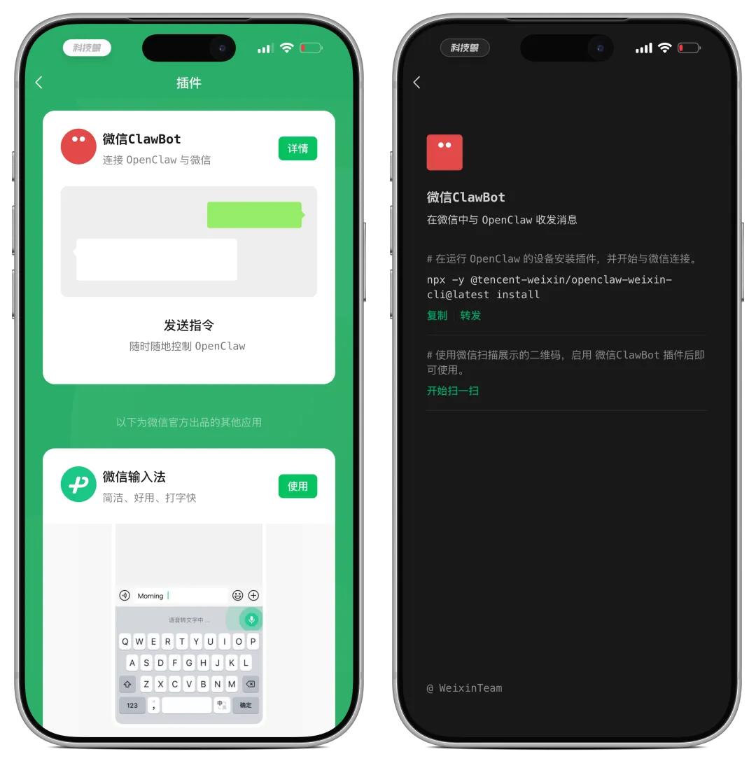 通过在运行 OpenClaw 的设备中安装插件后,即可扫码与微信连接,以后直接在微信里面与 OpenClaw 收发消息。