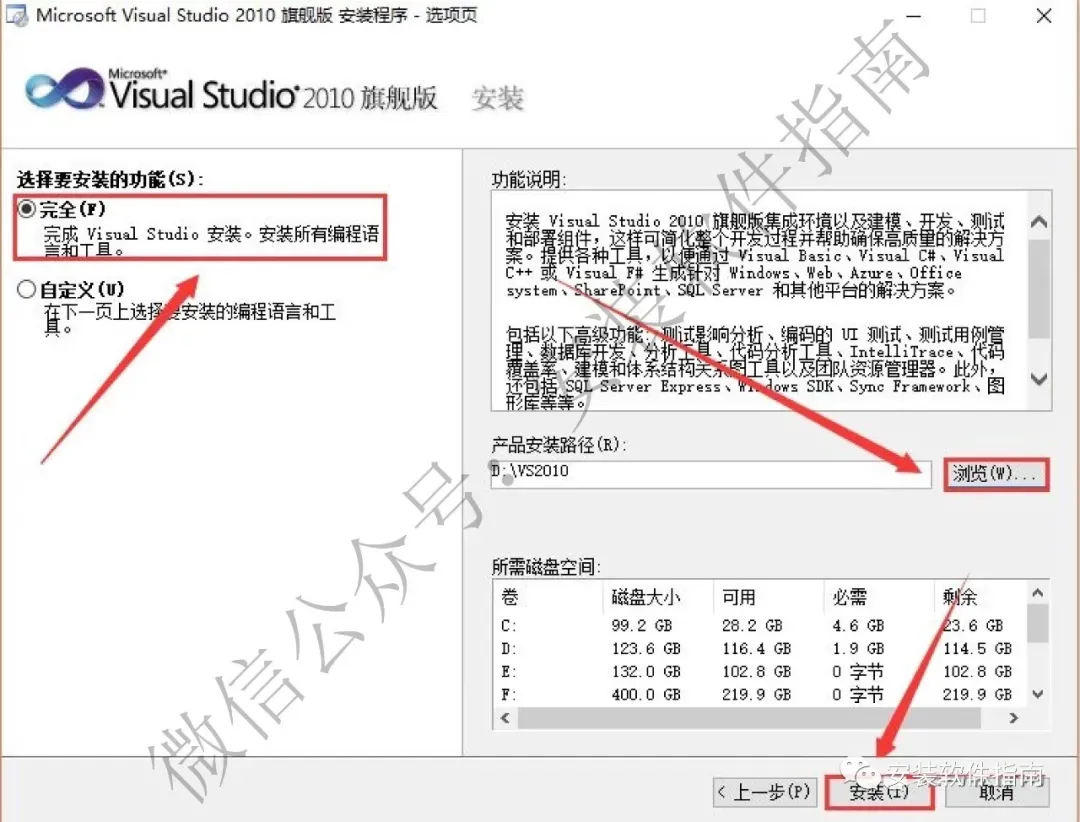 9.点【完全】,点【浏览】选择软件安装路径(建议安装在D盘里新建一个VS2010的文件夹),最后点【安装】