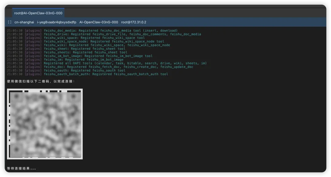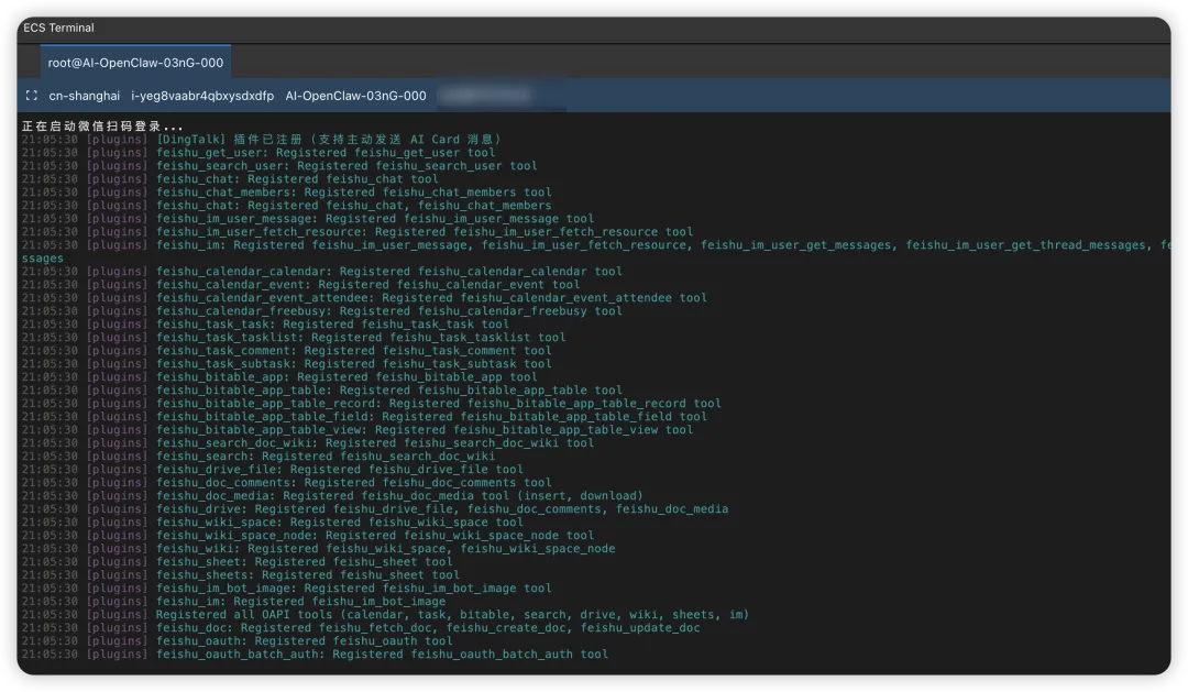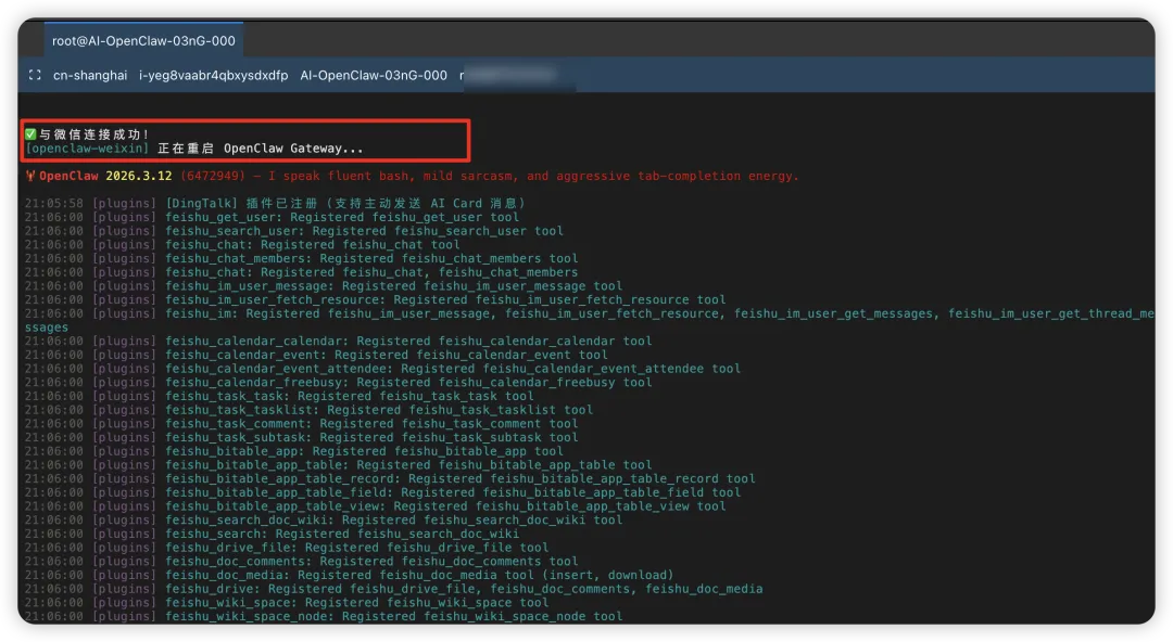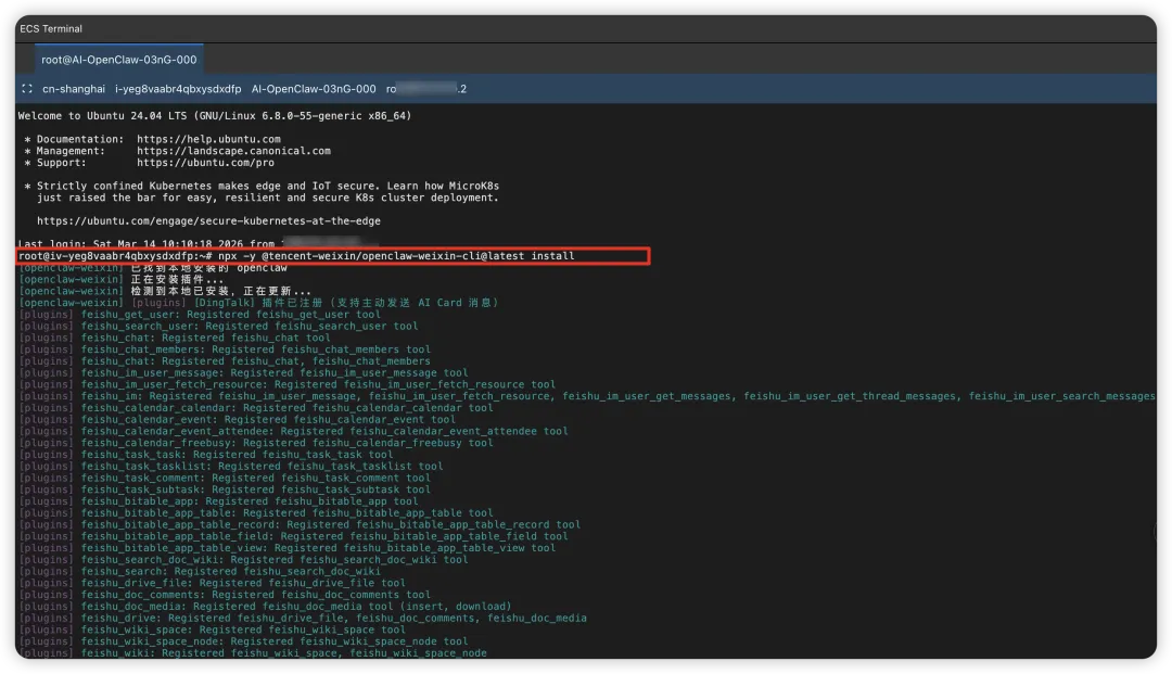 3. 打开你部署OpenClaw 的云端服务器的终端,并输入微信ClawBot插件命令6. 后台自动提示连接成功和重启,就可以在微信愉快养虾了!