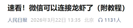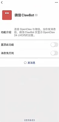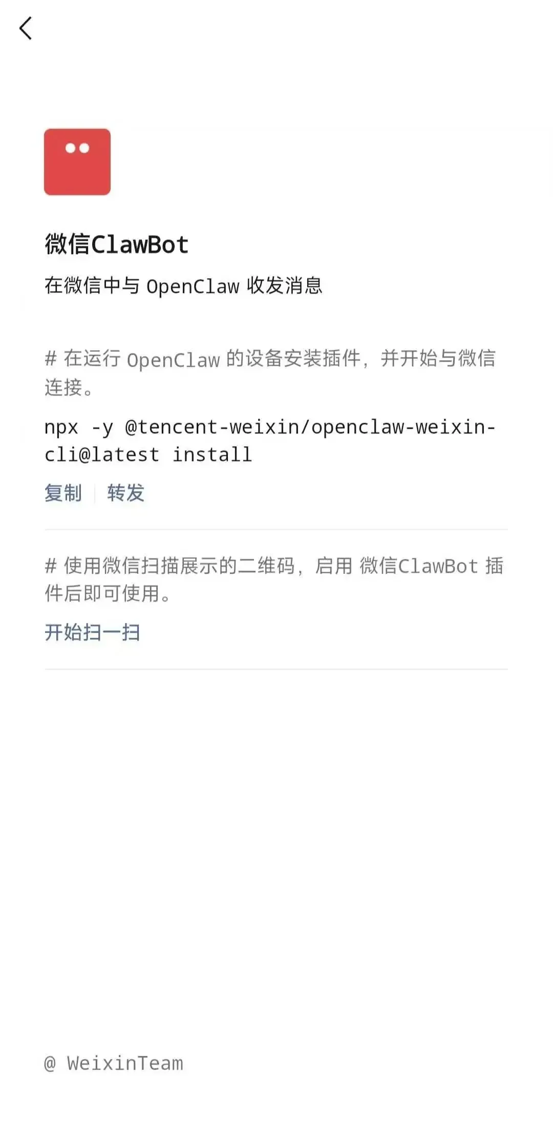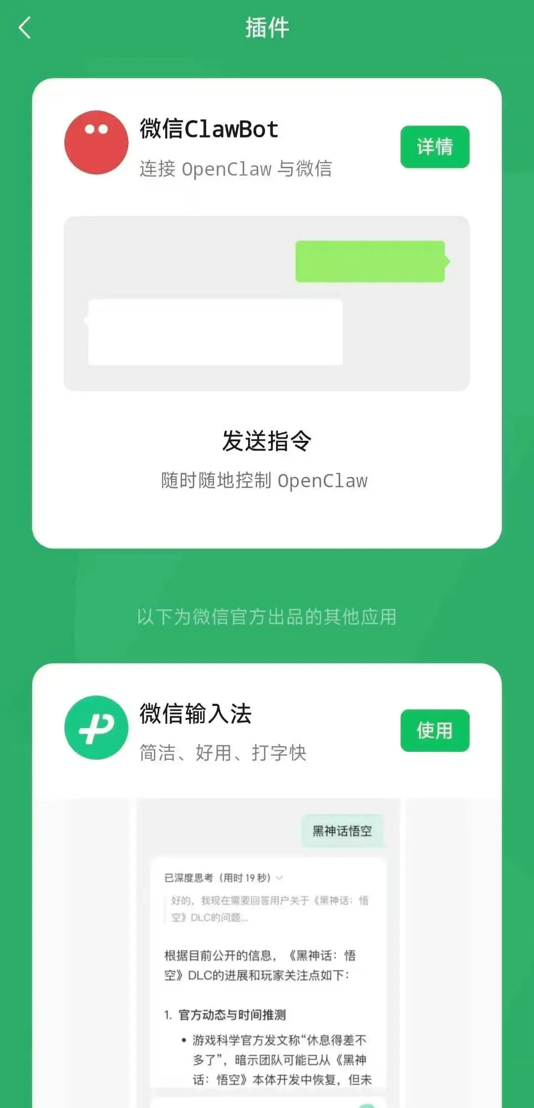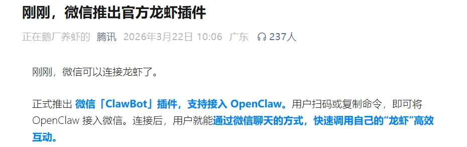 当国民级社交软件微信开始支持接入OpenClaw,人与智能体沟通的时代到来了!今天,一个新闻刷屏:微信可以连接OpenClaw了。不仅仅是各个AI媒体在发,就连央视新闻、人民日报等多个官媒也在发,可以见得影响之大。OpenClaw是一款开源的AI智能体,你可以通过自然语言指令让它帮你执行任务,因为它的Logo是一只龙虾,所以被称为龙虾。近日,腾讯推出了多个龙虾产品,WorkBuddy、QClaw、腾讯云OpenClaw服务器等等。这些产品支持接入微信,但这些都是腾讯基于OpenClaw推出的产品,也就是说你需要使用腾讯的龙虾产品才能接入微信,腾讯官方不支持你自己部署的OpenClaw接入微信。假如你想用自己本地部署的OpenClaw来接入微信呢?今天,微信官方亲自下场支持了。腾讯推出“微信ClawBot”插件。把微信升级到最新版,打开[设置]->[插件],会发现多了一个“微信ClawBot”插件。点击“详情”:只需要两步就能连接OpenClaw。第一步:在部署OpenClaw的电脑上执行如下命令安装微信插件:npx -y @tencent-weixin/openclaw-weixin-cli@latest install安装后会出现一个二维码。第二步:用微信扫描二维码,点击“连接”:连接后你的微信就会出现“微信ClawBot”这个联系人了,给它发消息就可以调用你本地部署的OpenClaw了。目前,一个微信账号只支持接入一个OpenClaw。微信作为一个十几亿人使用的社交软件,对于推出新的功能会非常谨慎,因为影响的是十几亿人的使用体验。当微信都开始下场支持OpenClaw,意味着智能体时代真的来了!从现在开始,微信不仅仅是人与人之间沟通的平台,也是人与智能体之间沟通的平台,未来还会是智能体与智能体之间沟通的平台。当每个人都养了只龙虾,以后打开微信,不仅是给朋友家人发消息,也可以给自己的龙虾发消息,十几亿微信用户就有十几亿龙虾,想象一下这个场景是多么的震撼。各位,准备好迎接新的时代:人与AI、人与智能体共生的时代!<- 完 ->