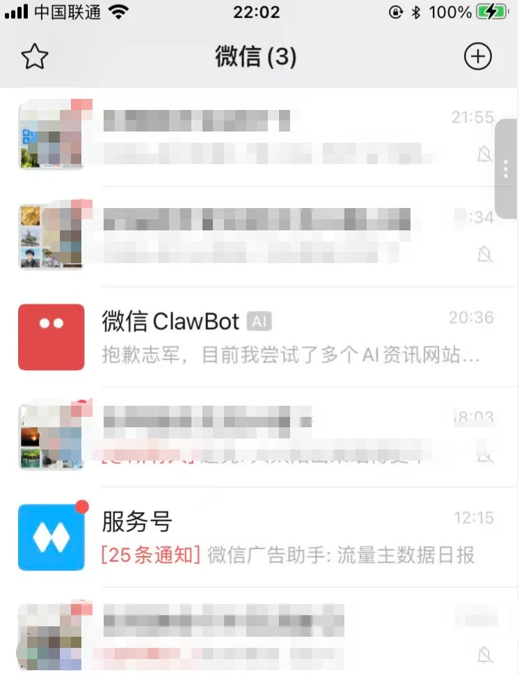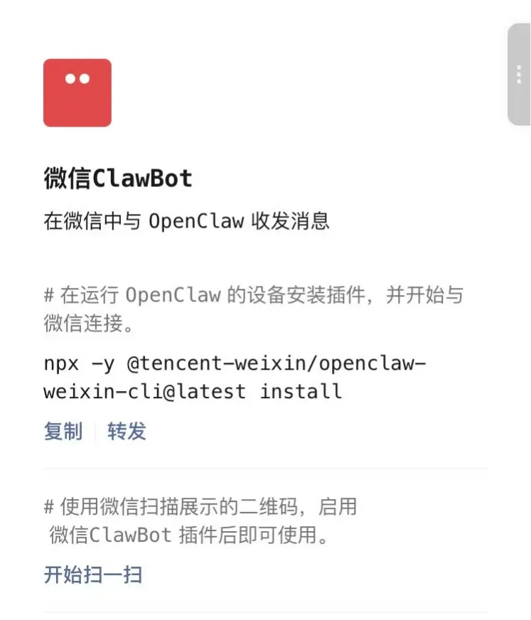 安装完成后,会弹出一个二维码,用微信扫码即可绑定Openclaw了。微信ClawBot出现在聊天首页,没有被折叠,和微信好友消息是同级的,非常便捷。我看网上有一些大神用ClawBot打通了Claude Code,这说明ClawBot不仅只是支持OpenClaw,所有符合规范的Agent都能接入进来,意味着,微信会牢牢把握住AI的流量入口。目前安卓版本的微信还没有这个功能,可能会晚一到两天,大家耐心等等吧。欢迎点赞、在看、转发三连。