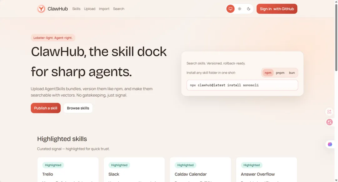 方法一:在clawhub下载现有技能。链接: https://clawhub.ai/。推荐收藏,这是我们养虾人的“正版基地”