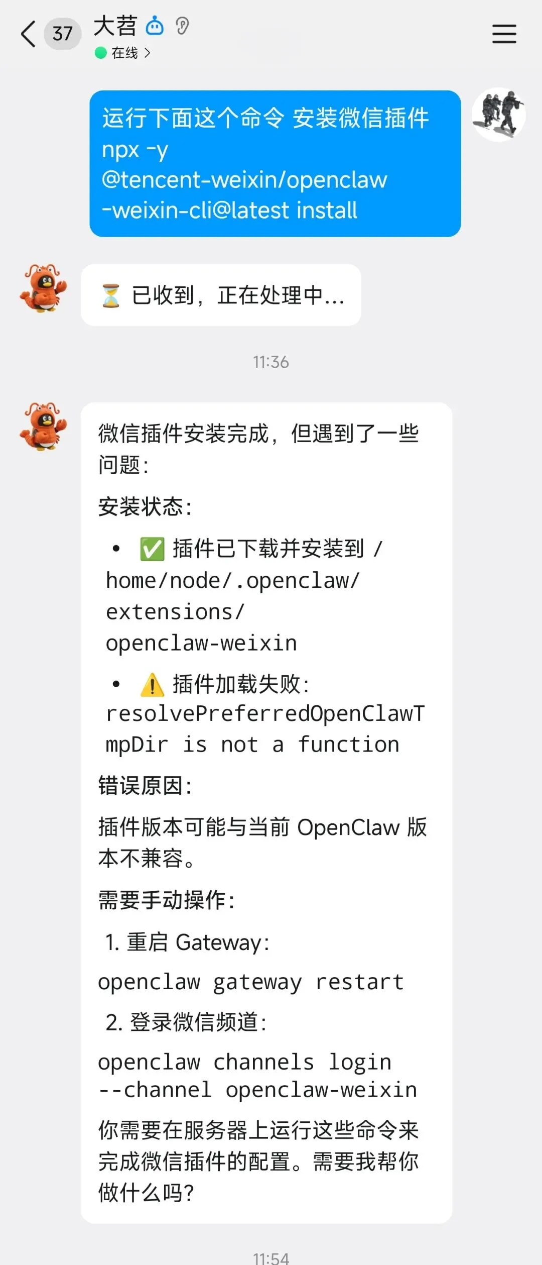 早上看到新闻就兴冲冲地开始安装,按照官方教程操作,安装倒是成功了,但遇到了几个坑 。下午花时间看了下代码,折腾了大半天,终于搞定,把过程记录下来分享给大家。先是按照微信的提示让openclaw自己安装 不出意外失败了.