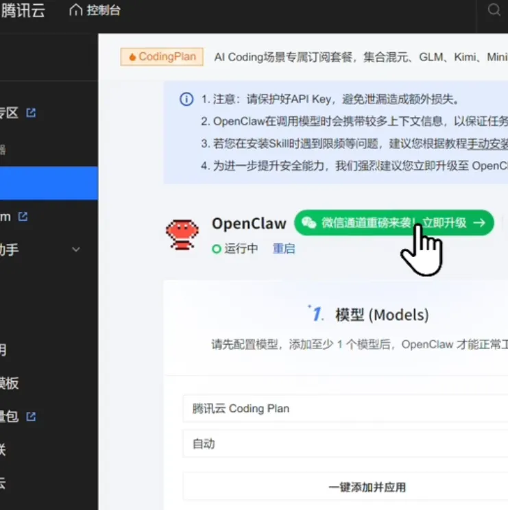 这里以腾讯云上的OpenClaw为例,如图,已经提示“微信通道重磅来袭”,怎么操作呢