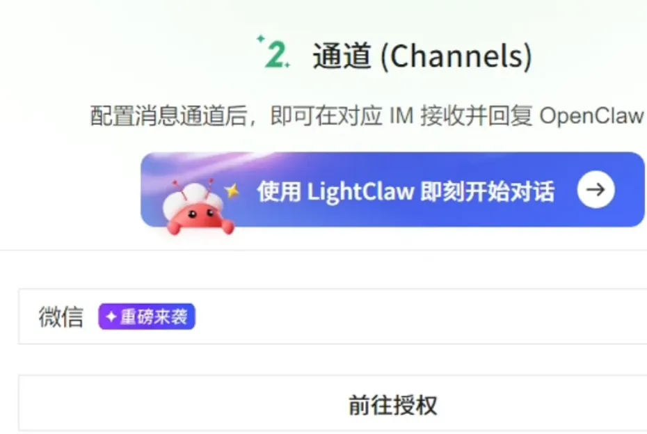 在服务器的“通道”,选中“微信”点击下边的“前往授权”,在弹出的二维码上,使用手机扫描,再弹出的界面点击“连接“,然后后自动跳到微信的ClawBot对话框界面,就可以和龙虾开始对话了。