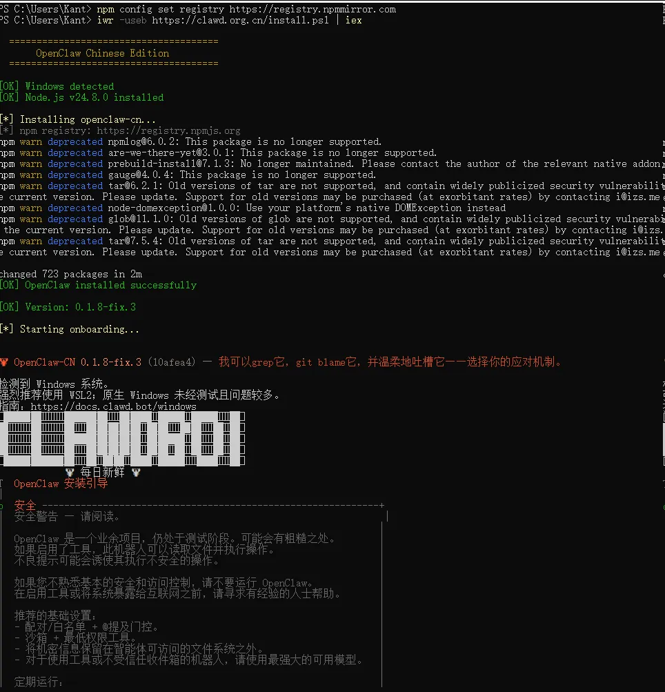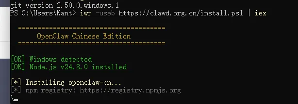 上面的工具安装好了以后,就可以安装openclaw了# 官方脚本(推荐) iwr -useb https://openclaw.ai/install.ps1 | iex# 若下载超时,使用国内镜像脚本 #iwr -useb https://clawd.org.cn/install.ps1 | iex