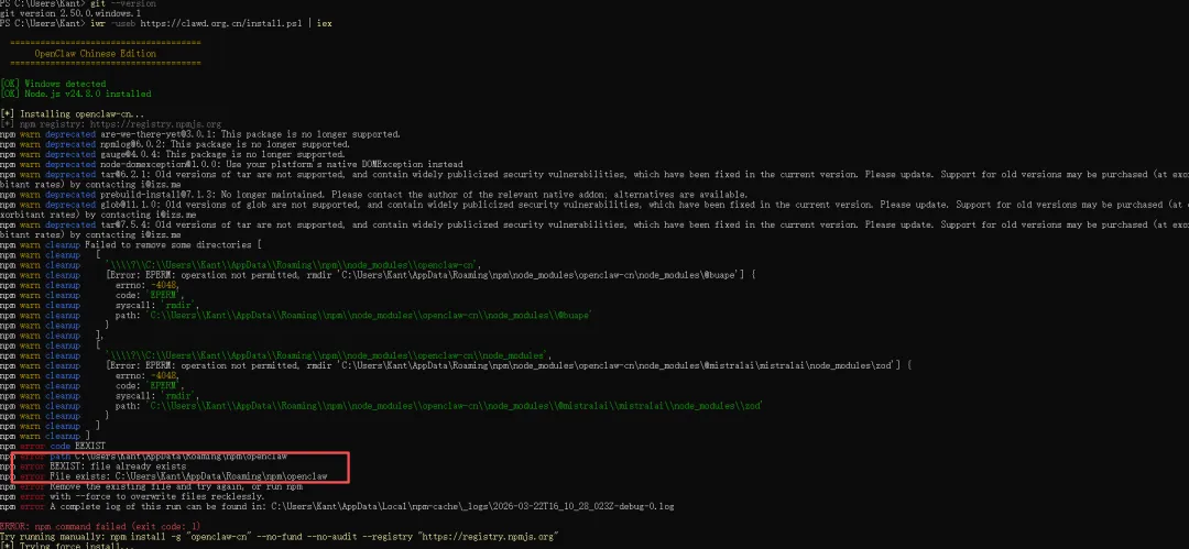 出错了,显示错误是npm error EEXIST: file already exists 。