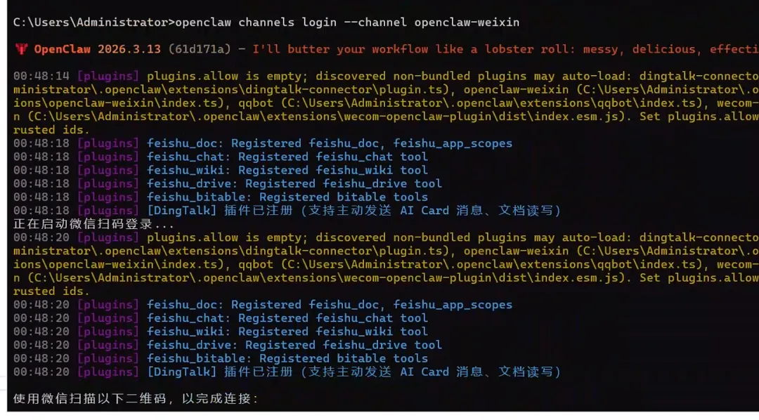 PS C:\Users\Administrator> npx -y @tencent-weixin/openclaw-weixin-cli@latest install