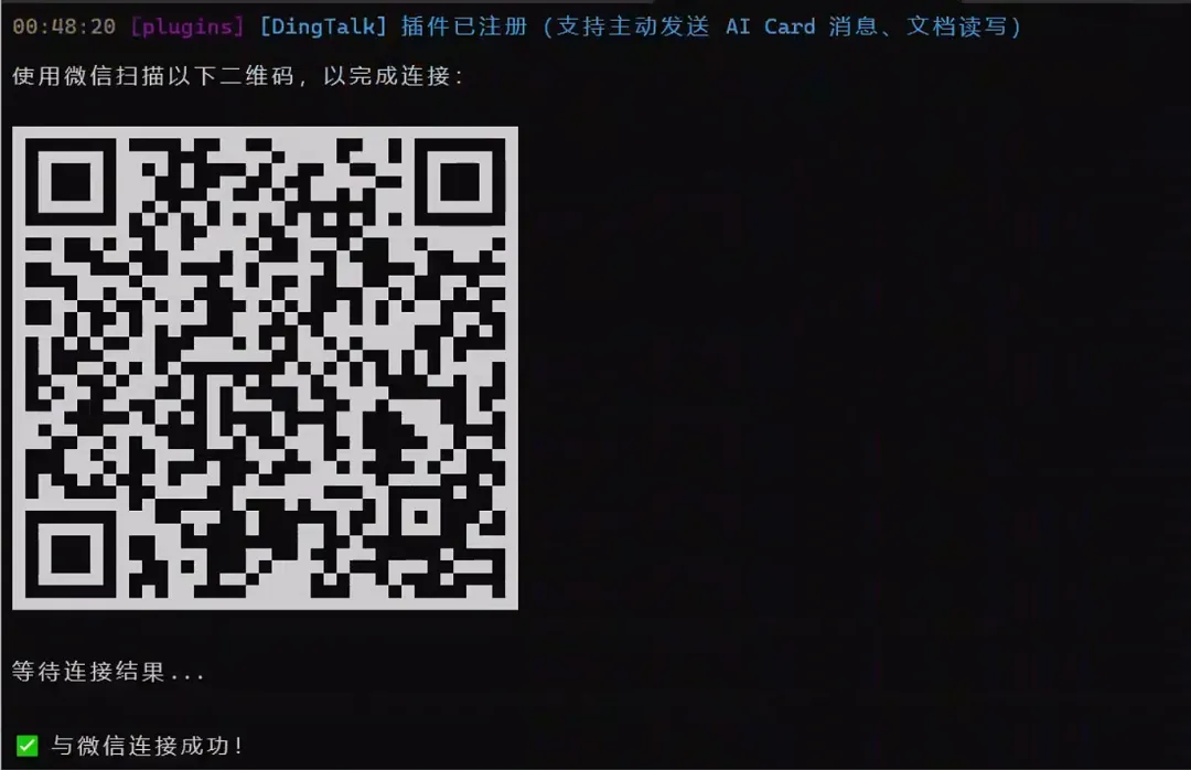 安装完后,如何连接呢,以为我们并没有之前那个命令的自动化一步到位的处理方式,所以这个时候要手动执行扫码连接的配置处理,执行这条命令: