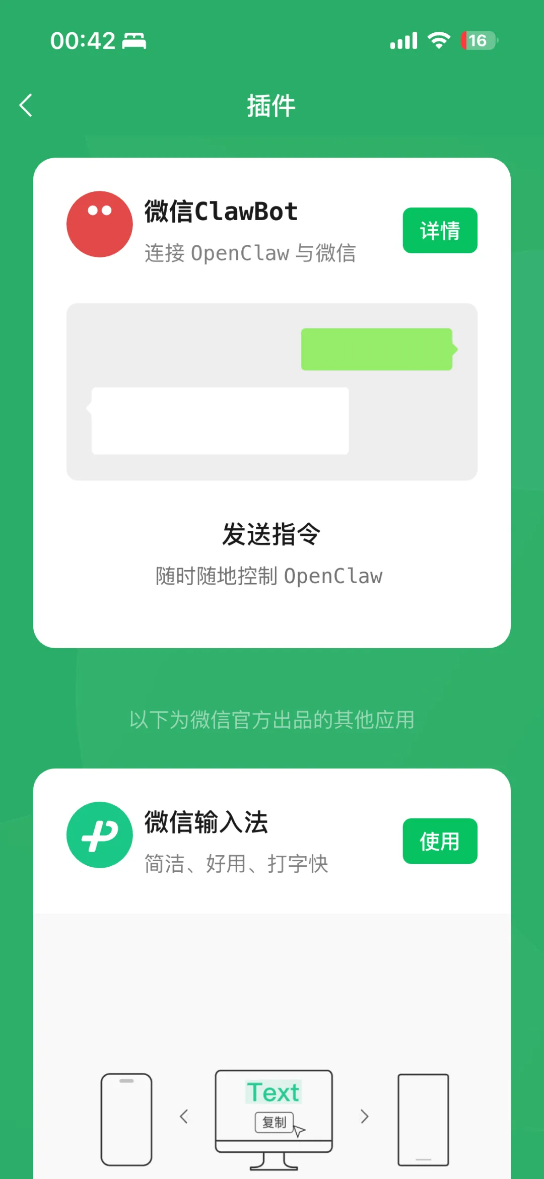 打开微信我 - 设置 - 插件。如果显示有微信Clawbot那么恭喜你已经可以使用了。