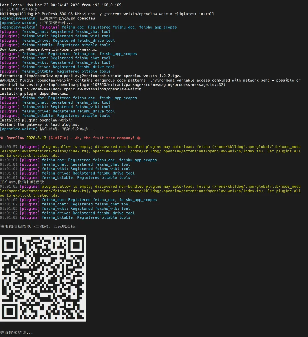npx -y @tencent-weixin/openclaw-weixin-cli@latest install回车之后等待一会就安装好了。最后它显示一个二维码,使用手机扫一下。如果成功的话 openclaw gateway 就会自动重启。