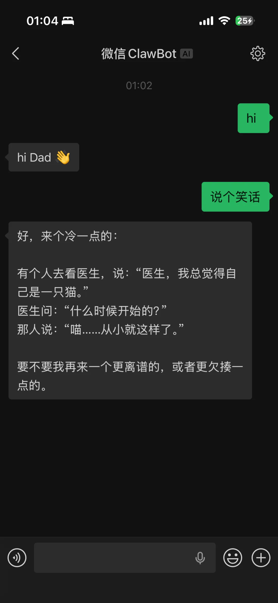 体验 网关重启后,微信上就会多出来一个叫 微信ClawBot的 bot。点击进入聊天,这样就可以跟 openclaw 对话啦。