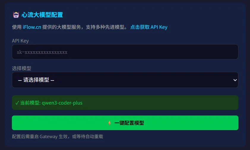点击「⚡ 一键配置模型」按钮,配置成功后会显示当前模型。