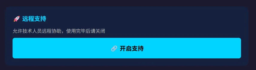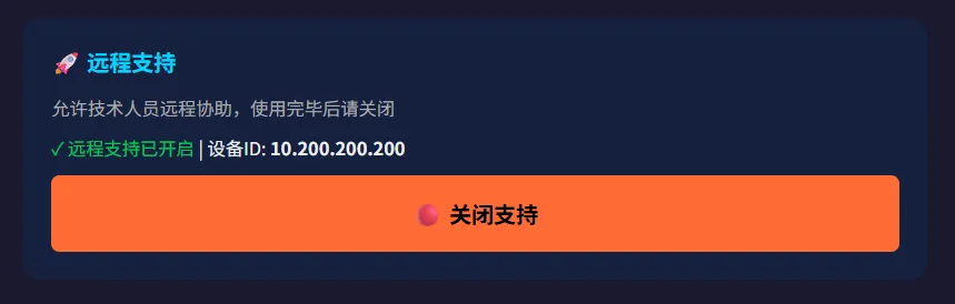点击「🔗 开启支持」按钮 等待连接成功,会显示设备 ID(如 10.200.200.144)将设备 ID 告诉技术人员 问题解决后,点击「🔴 关闭支持」