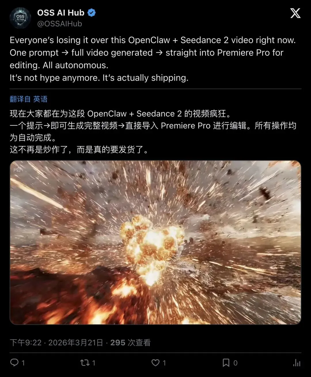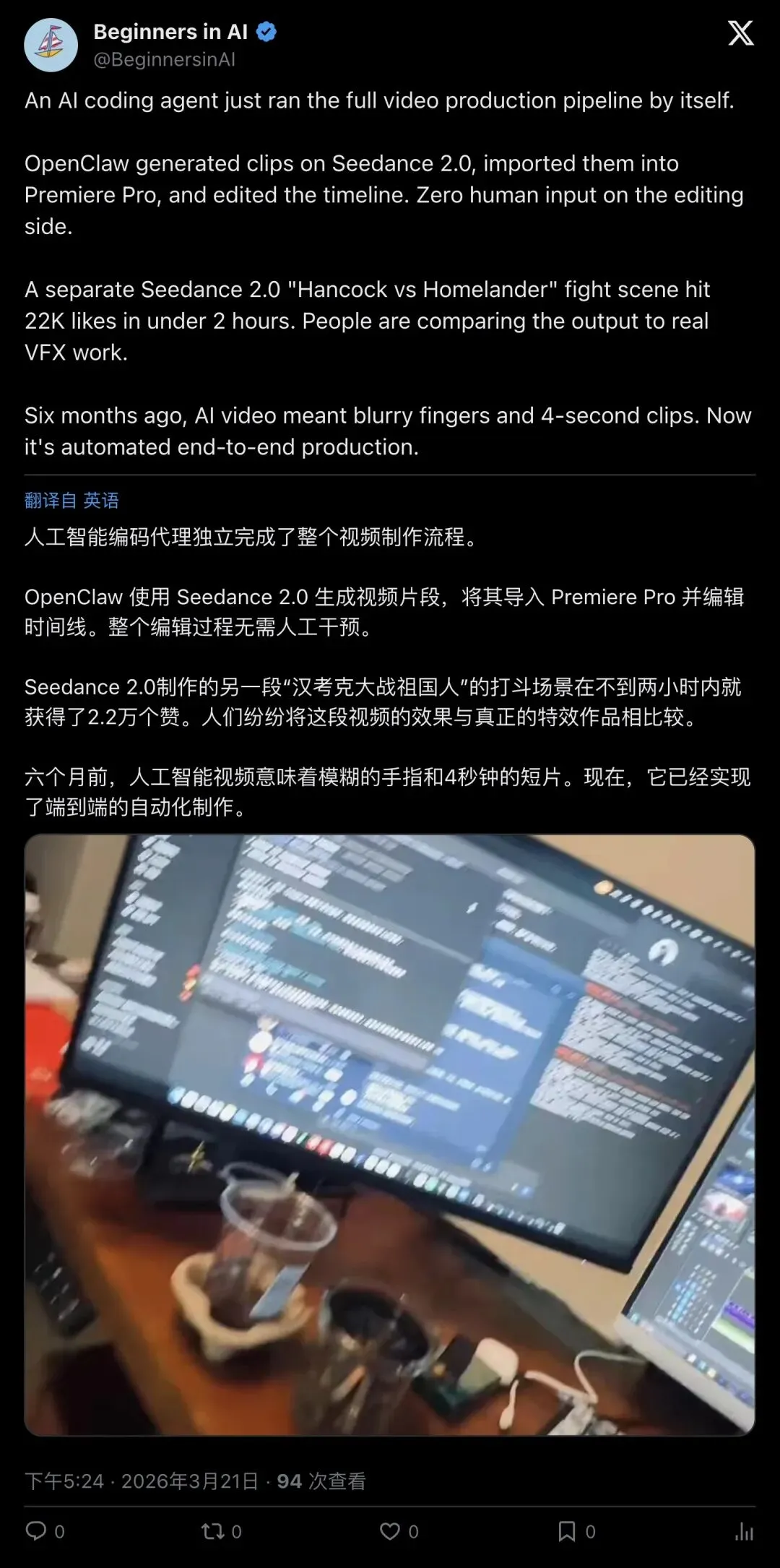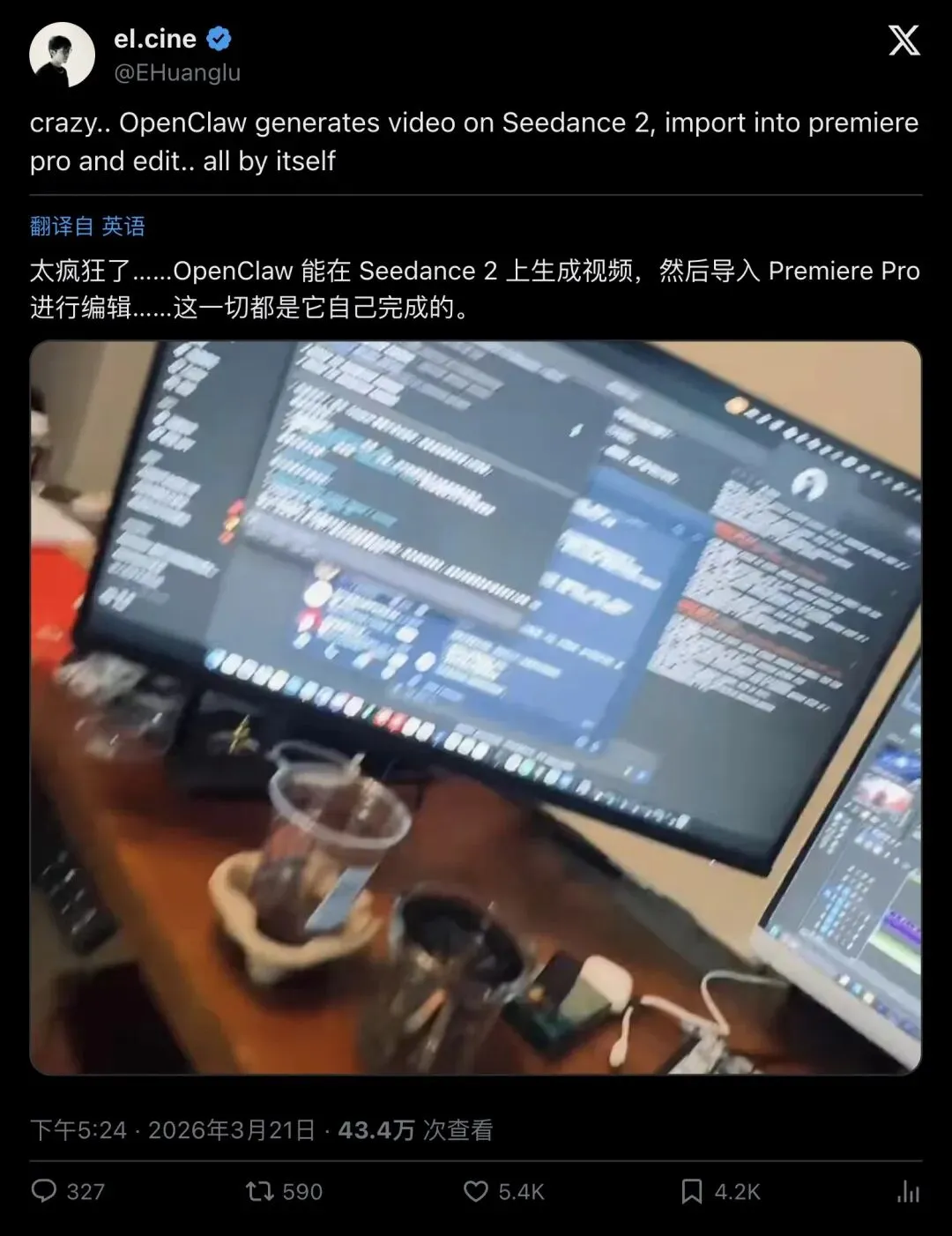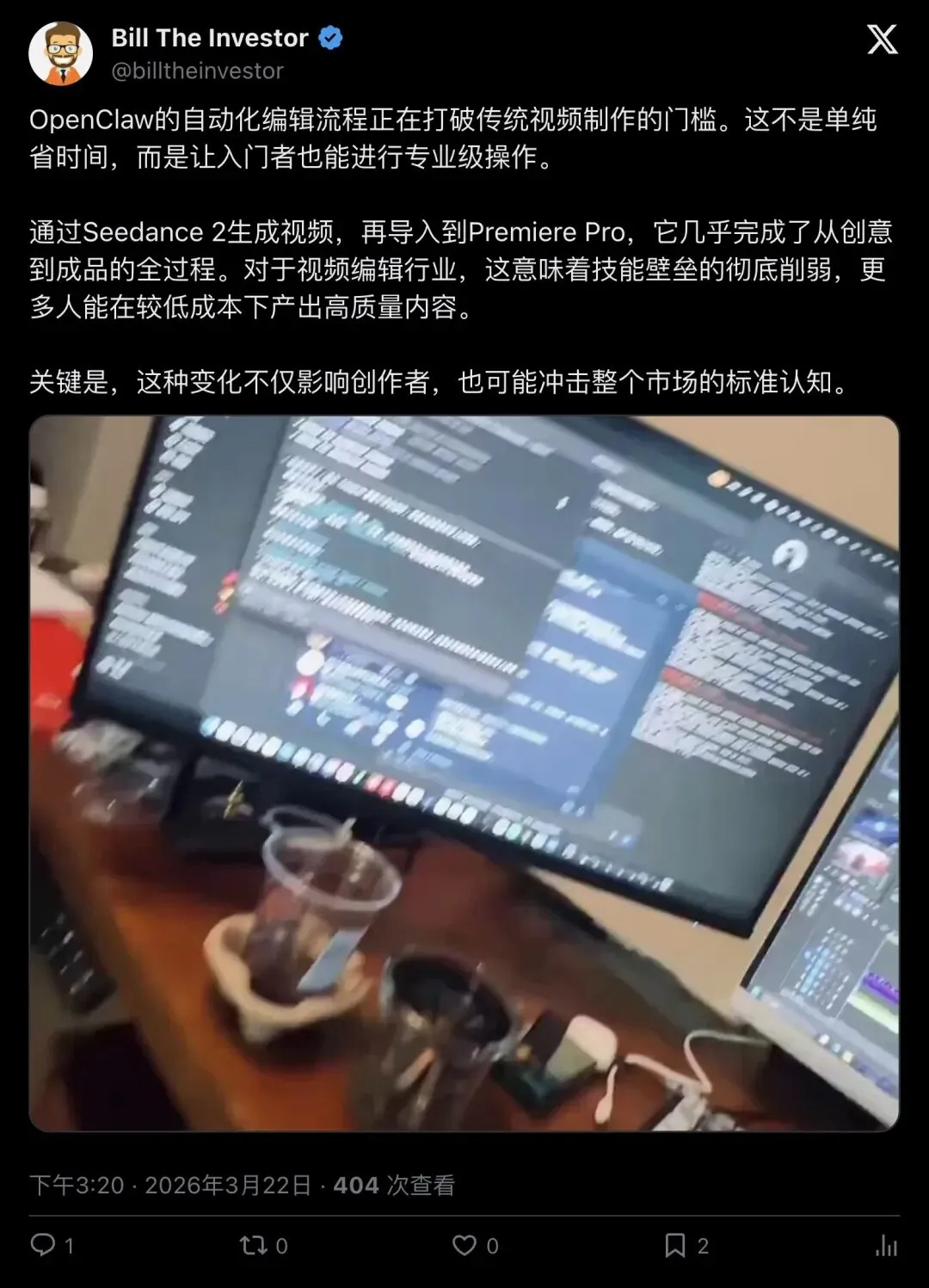 X 上一条爆火推文把无数人看傻:OpenClaw 先用 Seedance 2 生成视频,再把素材自动导入 Adobe Premiere Pro,甚至在时间线里自己剪辑、自己导出。原贴浏览量43万+、点赞5.3k+,跟风转述迅速扩散到多语种圈层。但别急着宣布“剪辑已死”——这更像一次把“生成(模型)+执行(桌面软件)”串成流水线的范式预演:惊人、可行、也充满不确定。