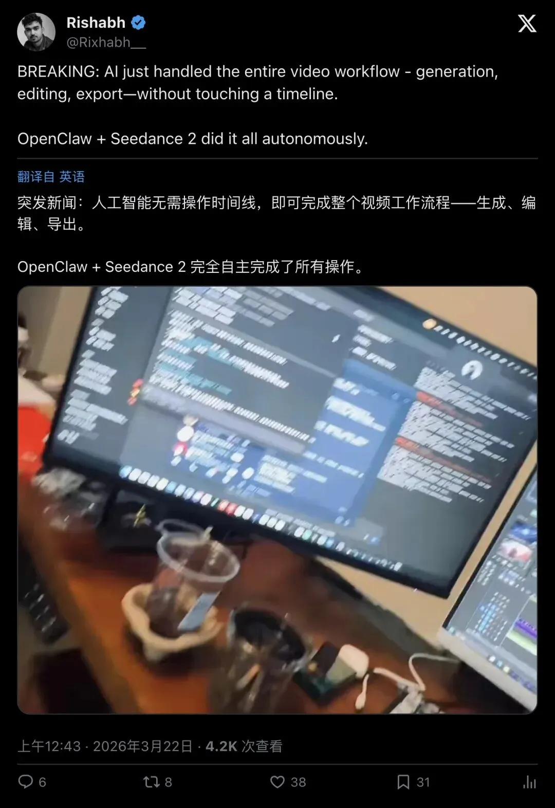 「太离谱了……OpenClaw 在 Seedance 2 上生成视频,然后导入 Premiere Pro 并自己剪辑……这一切都是它自己完成的。」