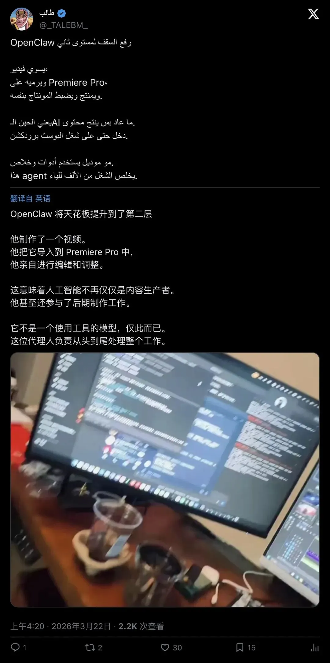 ▲ 阿语用户的兴奋:OpenClaw 把视频生成+Premiere 剪辑拉到“第二层”
