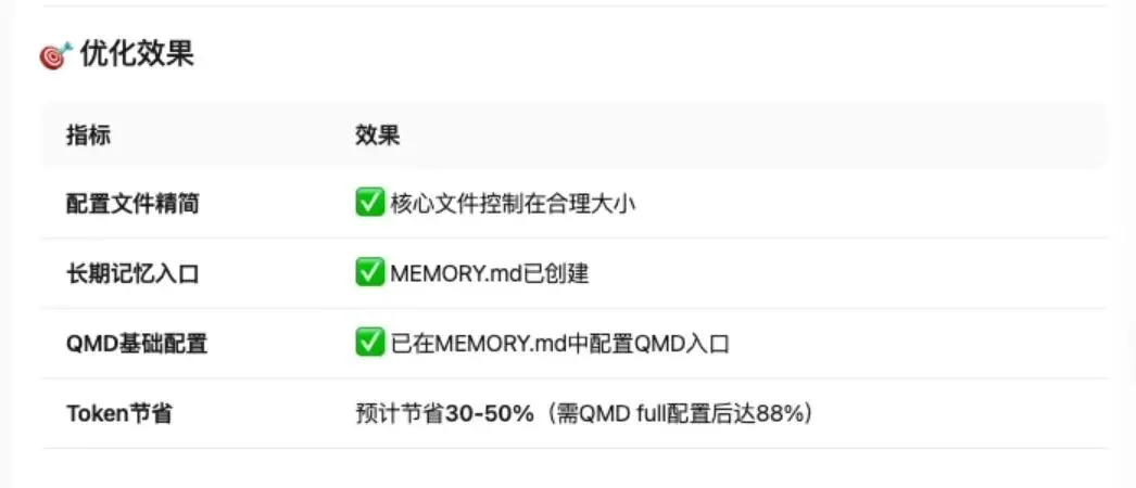 而且这个节省比例会随着对话长度增长而增大。对话越长,全量历史越臃肿,QMD 检索的优势就越明显。这就是为什么 10 轮对话省 88%,100 轮对话省 95%+。