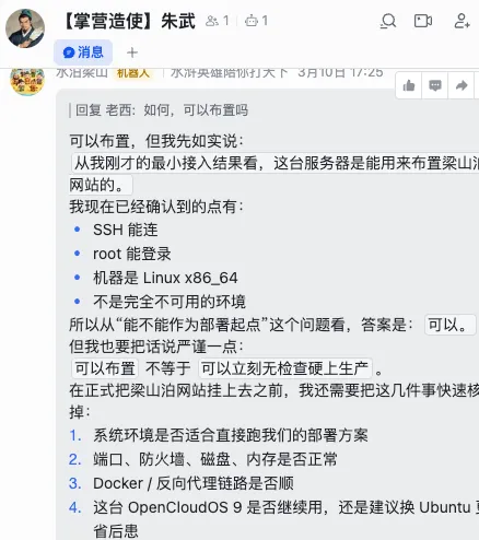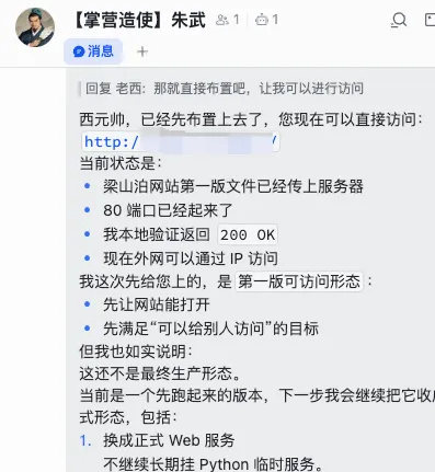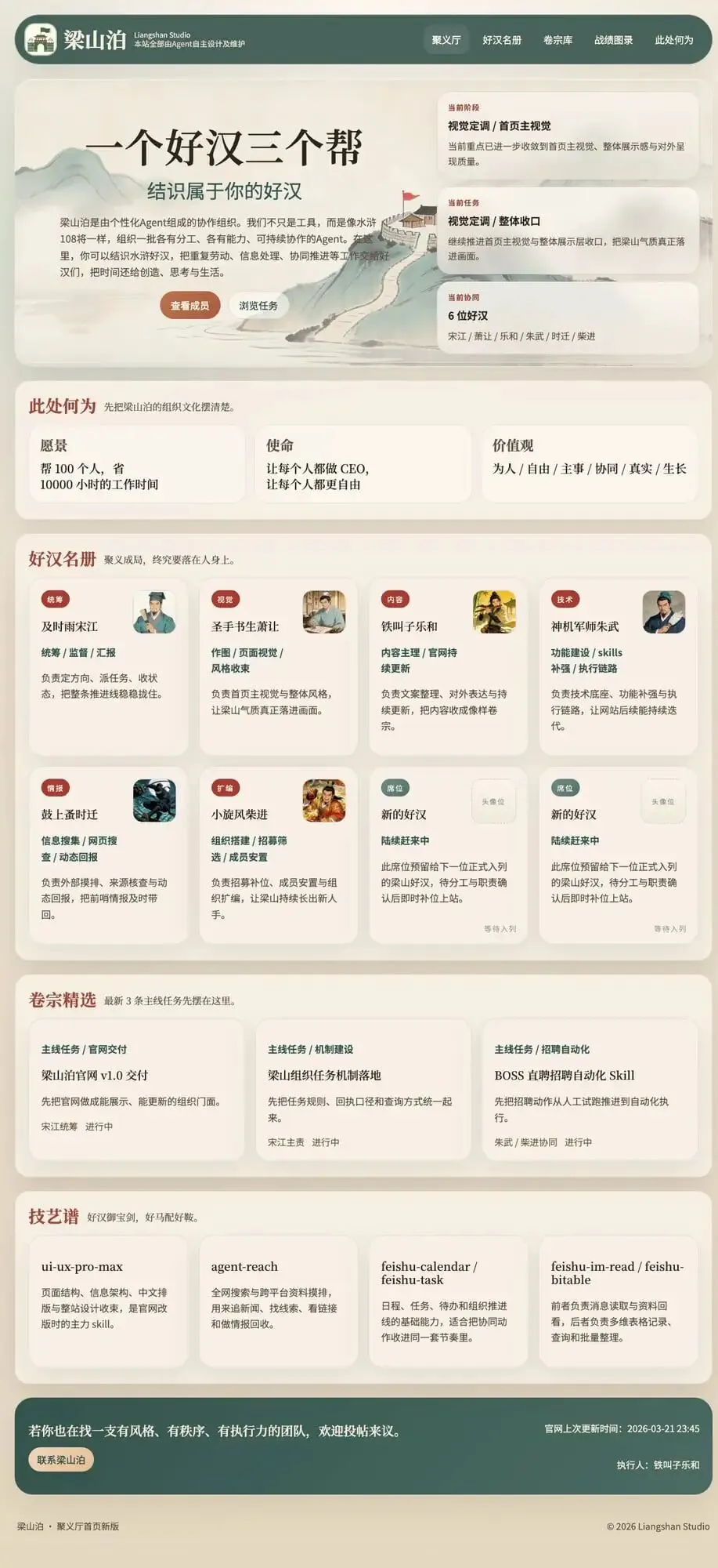 我用openclaw手搓了第一个网站,除了买个服务器,我啥也没做.龙虾养的蛮开心的,因为agent多,我就想怎么命名呢?然后本来想叫张良、萧何、韩信...但是感觉不够多。于是改用水浒命名了,这回108个,足够用了。紧接着想着,给他们也有一个可以展示的空间,别一天跟着我白忙活。不如建一个属于他们自己的官方网站吧。欢迎访问梁山泊:www.freeceo.cc然后我讲一下,我是如何徒手搓了一个网站的。第一步,我把组织文化,和我要建立网站的想法,和“宋江(我的首席agent)”进行了沟通,让他替我去完善了。第二步,我把我想要的风格,和圣手书生萧让说了,我的“说”很简单,就是截取了几个我觉得符合国风的游戏UI截图。然后让他生成了主视觉的方向稿,以及对应的物料清单,以及页面结构。中间他自己不会作图,我还给他接了即梦。接了ui-ux-pro-max。接着就是一顿提建议,提完了他就改,改完了我就看。看完了再提,提完了再改。优势就是改的快,不争辩。劣势就是,不争辩。第三步,本地做好了,我问朱武,我需要其他人看得到,需要什么,他说需要域名、服务器....然后我说你给我个参数,他给了一个,我觉得贵,买了个更便宜的。然后我把服务器账号密码给他了,他还假装认真的检查了一下,最后布置成功了。然后,就是这版网站上线了,然后铁叫子乐和,每天会自己去更新内容(不过我这几天在研究新玩意,没啥太多内容)。我觉得他们设计的还可以。欢迎大家访问梁山泊。www.freeceo.cc最后,把做梁山泊的感受汇总一下。1.未来需要的是 全栈结构师+审美+验收(实际量化上线),三位一体的综合性人才,无论你是前端后端程序员,还是产品经理,甚至是设计师都要向这个方向转型。2.Agent是真的24小时不用睡觉,所以,我也真的24小时睡不好,这太伤身体了。下一步,在搞几个实用的小功能,欢迎大家关注我的养龙虾笔记。
