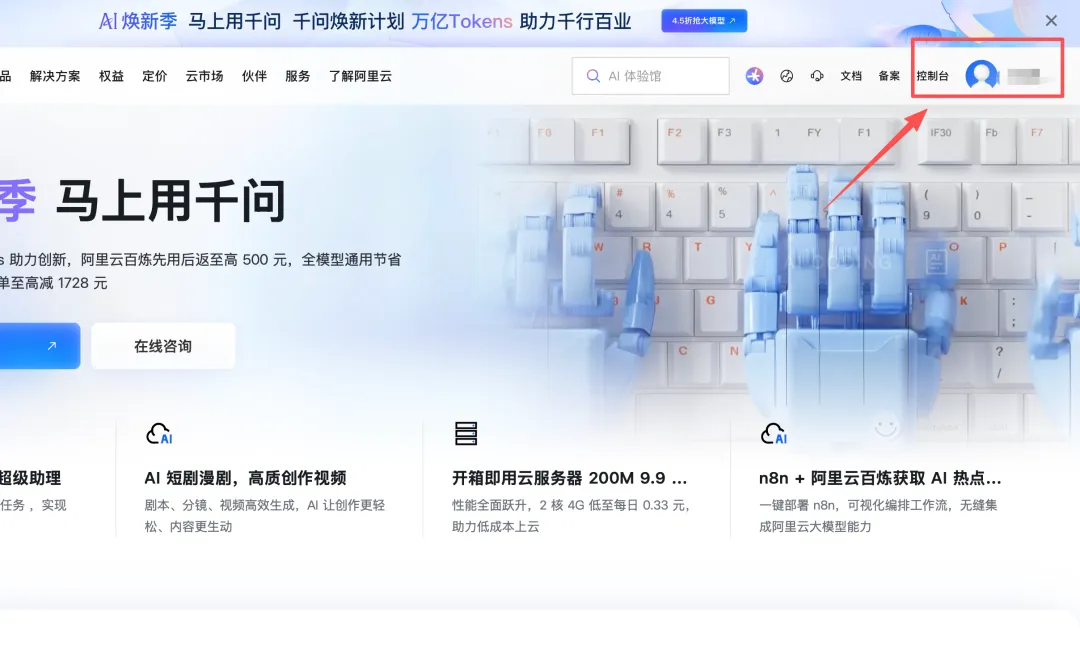 2. 如果没有阿里云账号,需要在右上角先注册并完成实名认证(需要手机号)