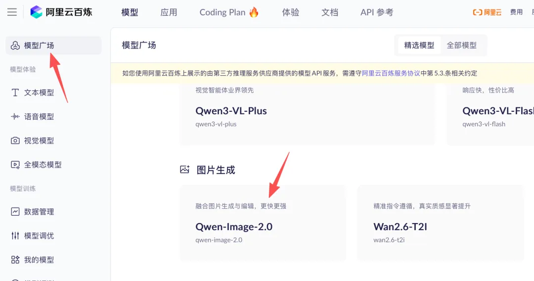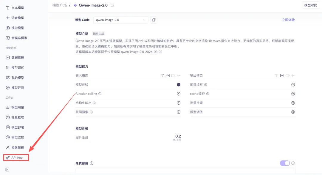 • 新用户Qwen-Image-2.0和Qwen-Image-2.0-pro都有100张的免费额度,可以在「当前模型」查看