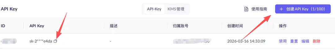 1. 在 API-KEY 管理页面点击右上角的「创建新的 API-KEY」