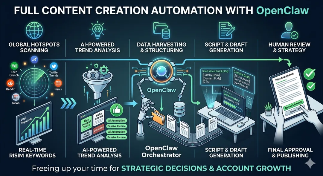 从找选题到出初稿,这一整套流程都可以自动完成。你只需要做最后的审核和发布。当内容生产自动化之后,你的时间可以全部用在真正重要的事情上:选题判断和账号运营。