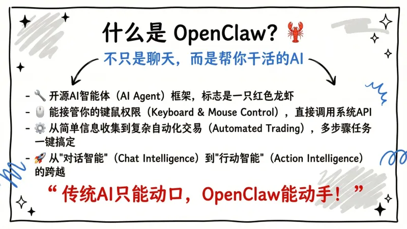 OpenClaw 是一个标志为红色龙虾的开源AI智能体框架,其核心突破在于能够接管用户电脑的键鼠权限并调用系统API,实现了从“对话智能”到“行动智能”的跨越,即AI不仅能回答问题,更能直接替用户操作电脑完成任务。该框架在不到3个月内获得超过31万GitHub星标,成为全球顶级开源项目,并在中国演变为一场名为“养虾”的全民社会现象,覆盖从儿童到老年的各年龄段人群,甚至引发线下排队安装和两会代表的讨论。