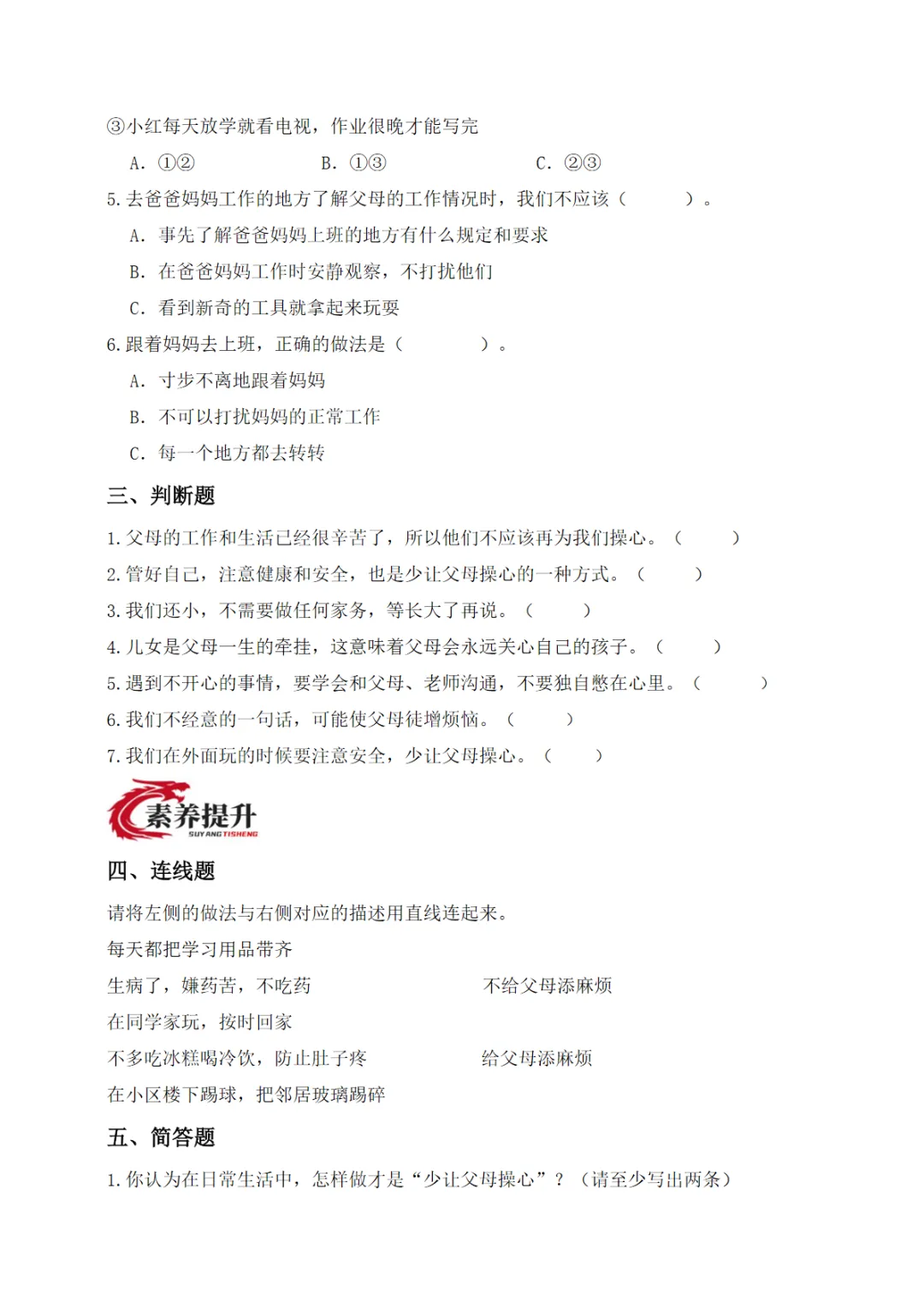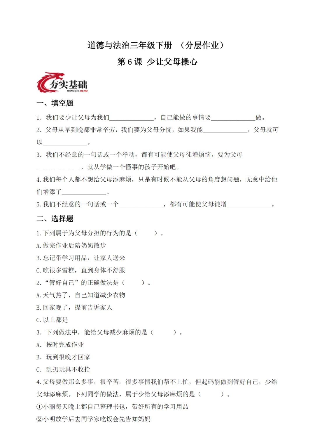 三年级(下)道法 第6课 少让父母操心(分层作业)