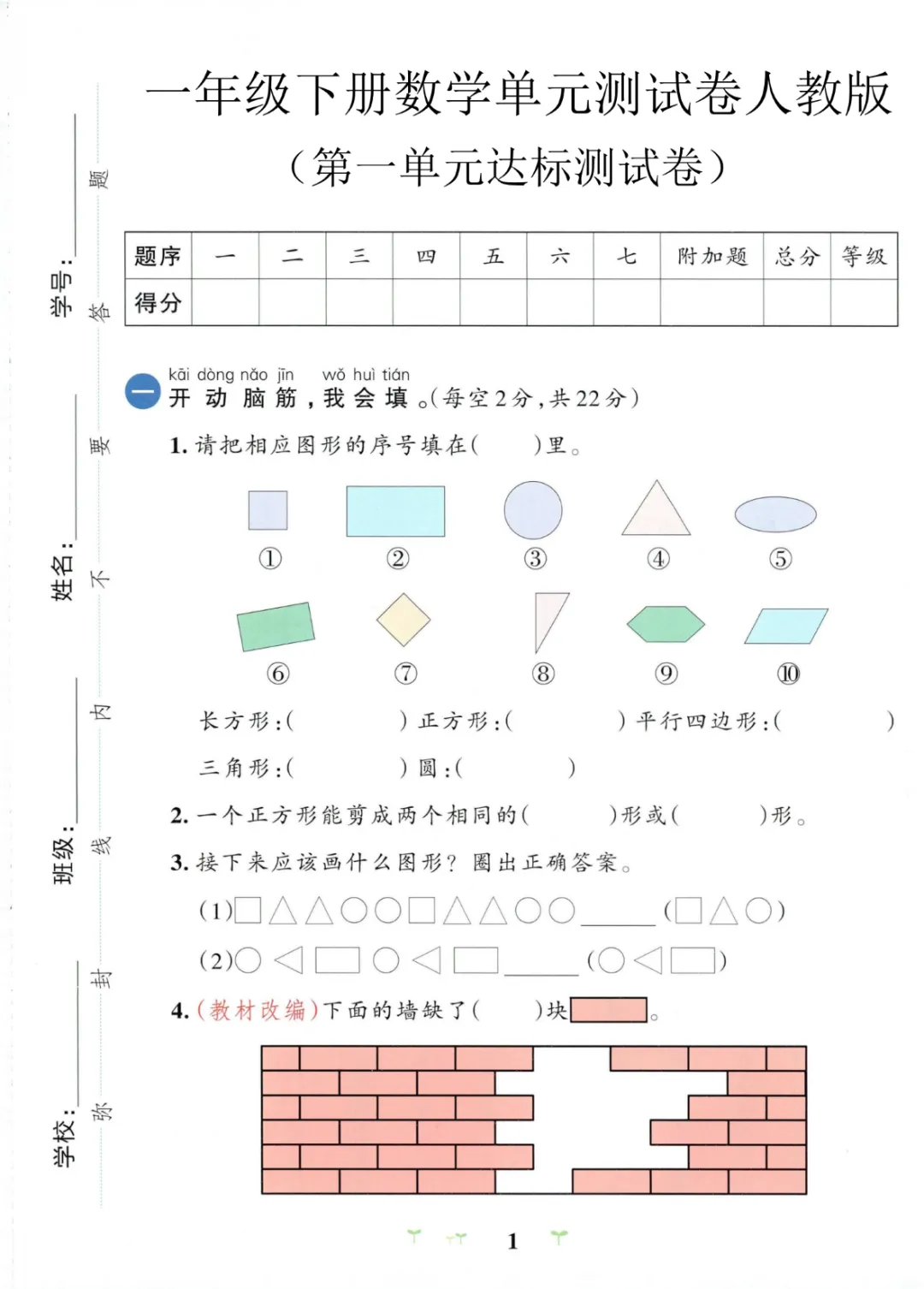 一年级(下)数学 第一单元达标测试卷《人教版》