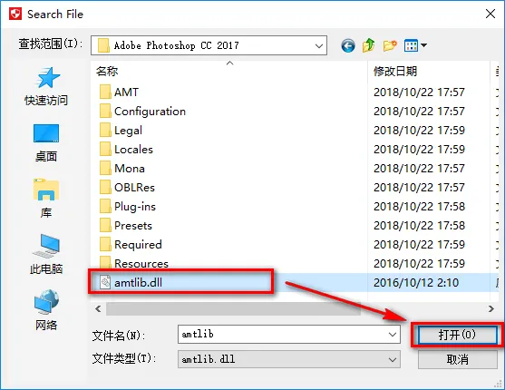 8.在弹出的文件资源管理器中,找到软件安装目录下的amtlib文件,点击“打开”。 默认路径为:C:\ProgramFiles\Adobe\Adobe Photoshop CC 2017