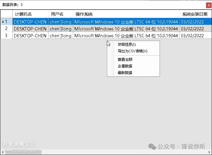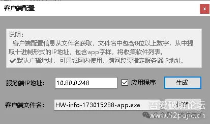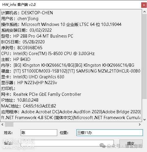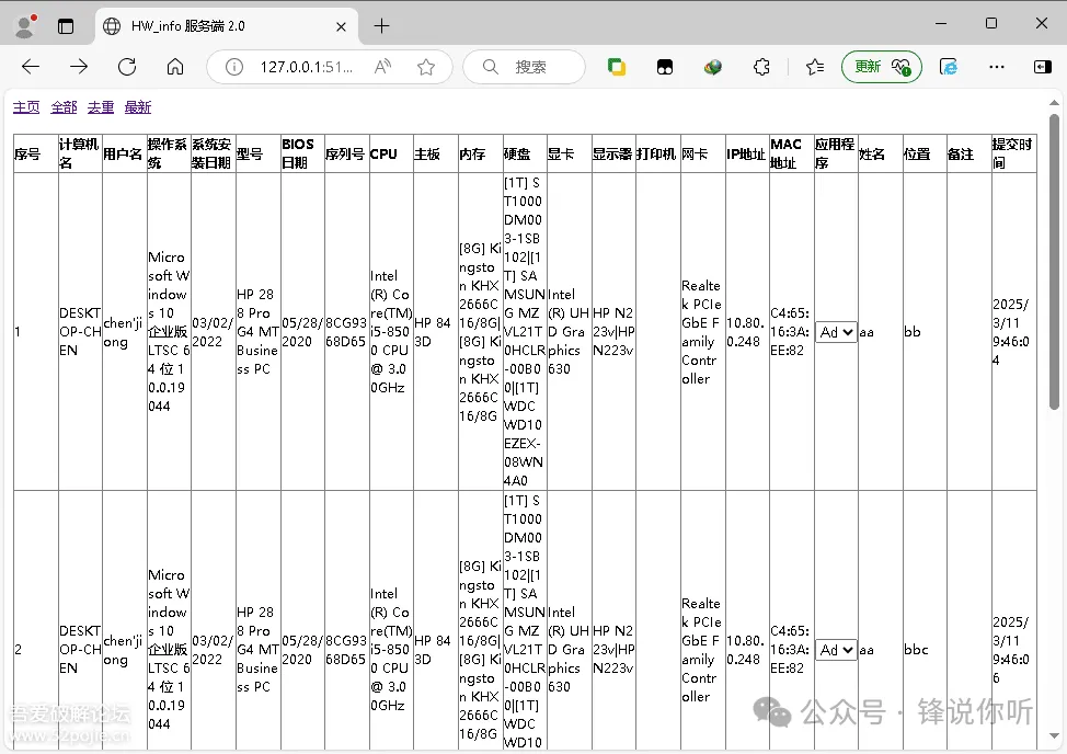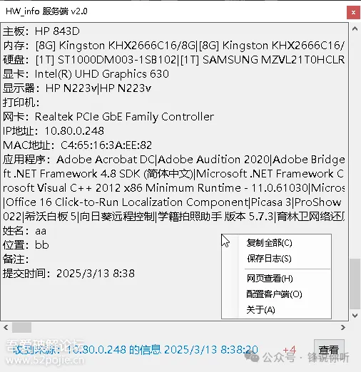 简介快速批量收集电脑系统硬件信息,发送到服务端,可作资产管理。信息收集包括计算机名,用户名,操作系统,主机型号,序列号,CPU,主板,内存,硬盘,显卡,显示器,打印机,网卡,IP地址,MAC地址。服务端服务端客户端实际是同一个文件,启动方式文件名包含-svr或命令行参数-svr开放端口 udp和http 51528