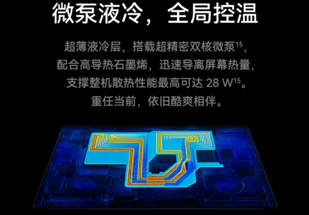 处理器升级之外,液冷版还塞了一套“微泵液冷层”。这套散热方案包括超精密双核微泵、高导热石墨烯、双VC设计,加起来能把散热效率拉到28W。