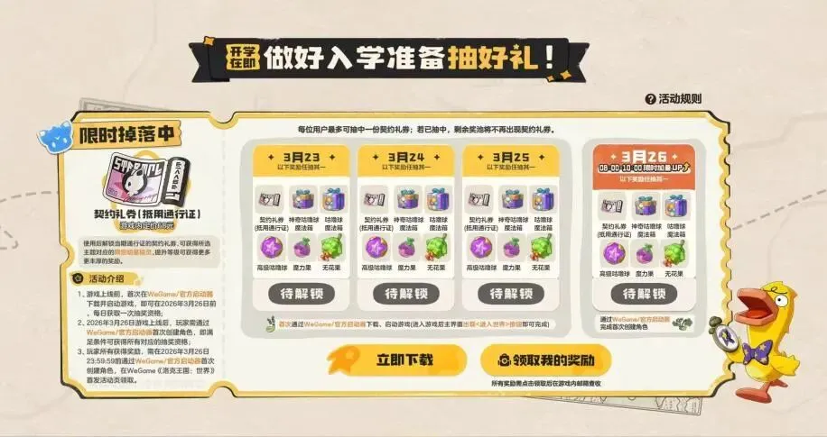 3月23日起,即可参与入学抽好礼活动。后面几天入坑的小洛克也别担心,3月26日游戏上线后依然可以参与该活动,但获得抽奖机会的条件各不相同——
