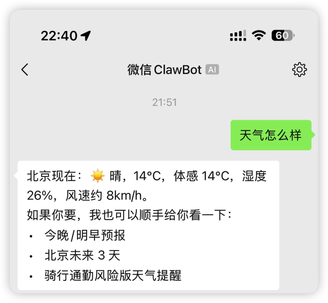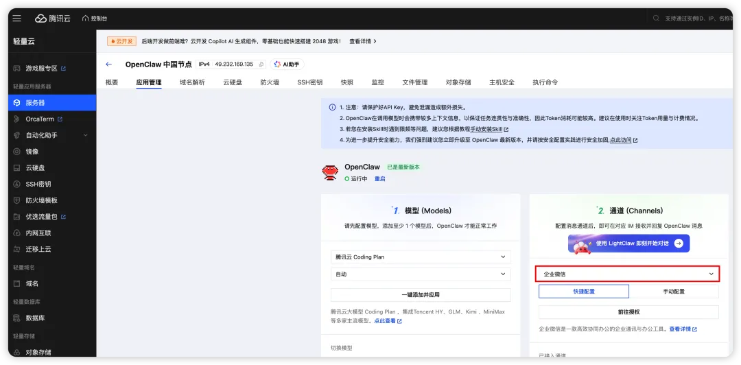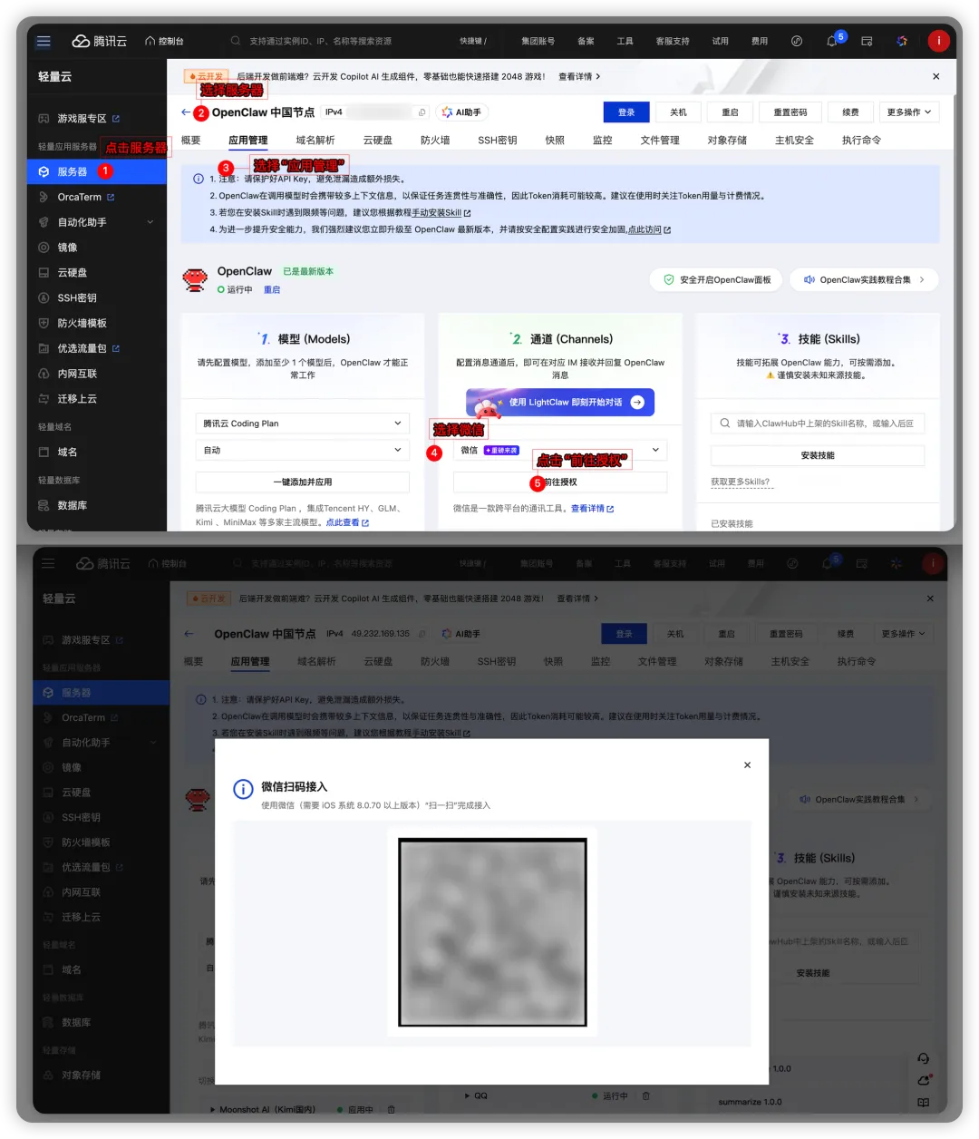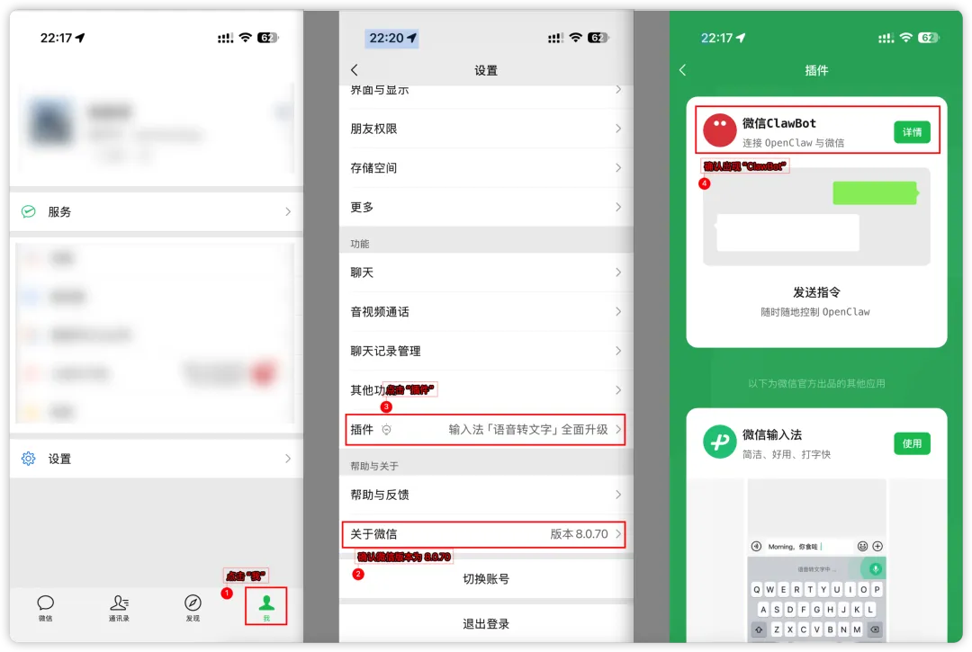 把 OpenClaw 一键接入微信:AI Agent 终于不再是命令行玩家的专属大致流程为升级微信到最新版,然后去腾讯云 Openclaw 中用微信扫描二维码即可生效,绝不会涉及任何命令行操作!如果是通过云服务器部署的 OpenClaw 接入微信,是无法操作你微信的,因此安全问题不必担心,如果还是有顾虑,可以临时申请个微信号码来体验下。说明:微信 ClawBot 目前一个微信账号只支持绑定一个 OpenClaw01具体步骤必须更新微信到最新版8.0.70,更新到最新版本之后,必须重启微信。(手机底部上滑杀微信应用即可生效)检查 ClawBot 是否生效,在插件页面看到 ClawBot即可。去腾讯云的OpenClaw中配置微信的 ClawBot,扫描二维码即可,同时也需要确保 OpenClaw 为最新版,左侧龙虾图标会有版本升级提醒。在手机中打开微信App,用微信扫一扫直接扫描前面的二维码,扫码完成后,将直接进入到微信ClawBot的对话页,此时正式完成。从使用体验上来看,微信 ClawBot支持的消息类型很丰富,体验很不错。尤其是支持输入语音消息,还是非常方便的。02传统命令行操作方案如果没有使用腾讯云的话,目前还是不得不在命令行中输入相关的代码,太反人类了。(大家就能理解为什么我一直推荐腾讯云)03QQ接入方式QQ 接入方式也是一如既往的简单,在通道处选择 QQ,然后快速配置即可。操作上和微信接入基本一致,体验非常丝滑。目前,大家主要使用微信,因此就不在此进行赘述,如有需要,可在留言中回复 QQ 接入方式,后续我再补充一篇 QQ 接入方式的文章。