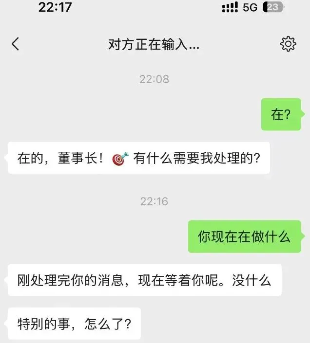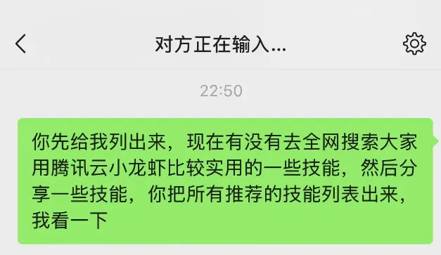 现在,打开微信直接和 ClawBot 聊起来吧。有一个细节挺有意思——对方回复消息时,顶部会出现「对方正在输入…」的提示,跟真人聊天一样,体验感一下子就上来了。