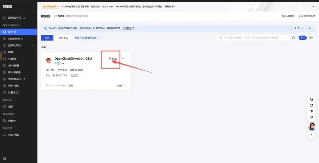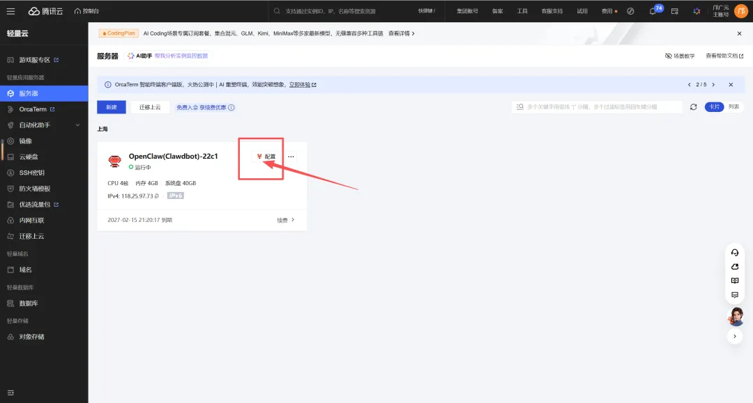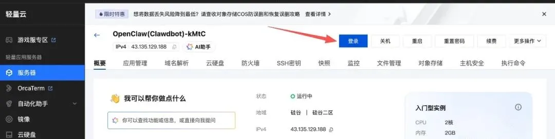 登录腾讯云,在云服务器列表里找到你跑 OpenClaw 的那台机器,点进去。