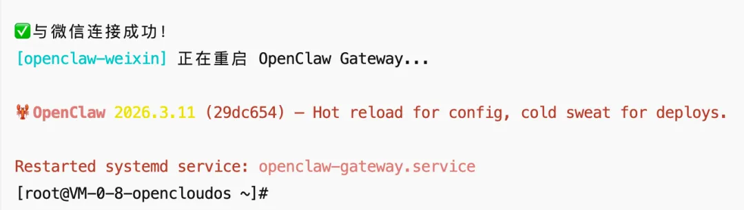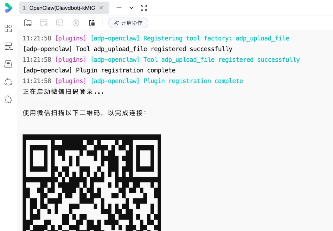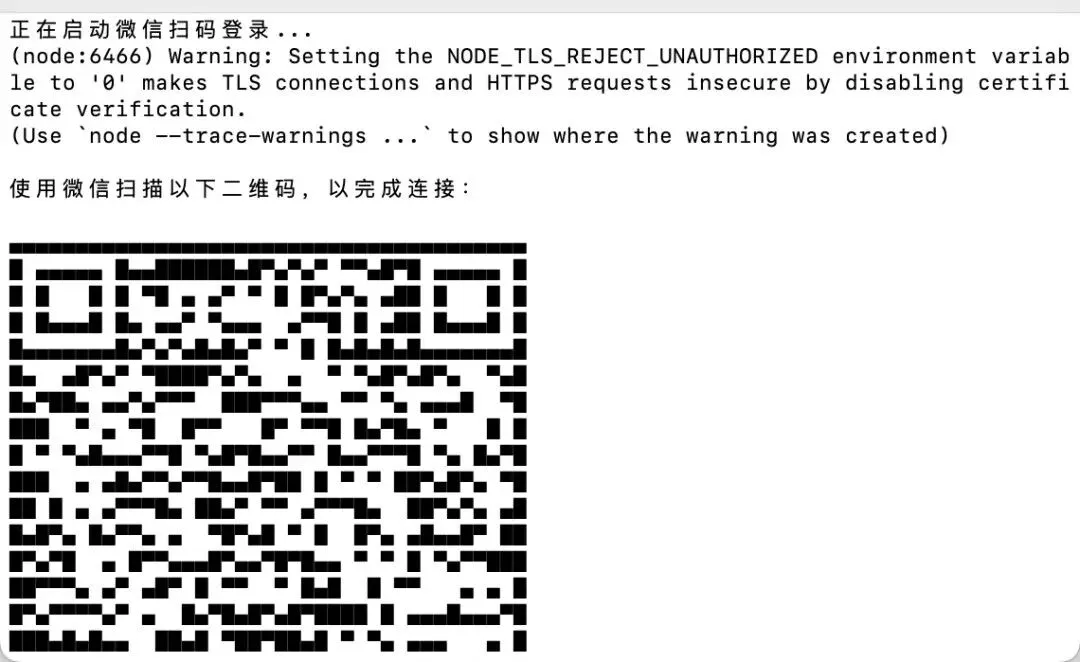 安装完毕,二维码会直接弹在终端里,微信扫一扫就绑上了。