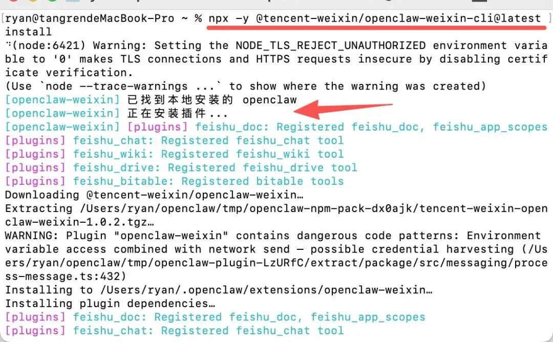 运行后终端会提示正在安装微信插件,稍等片刻。