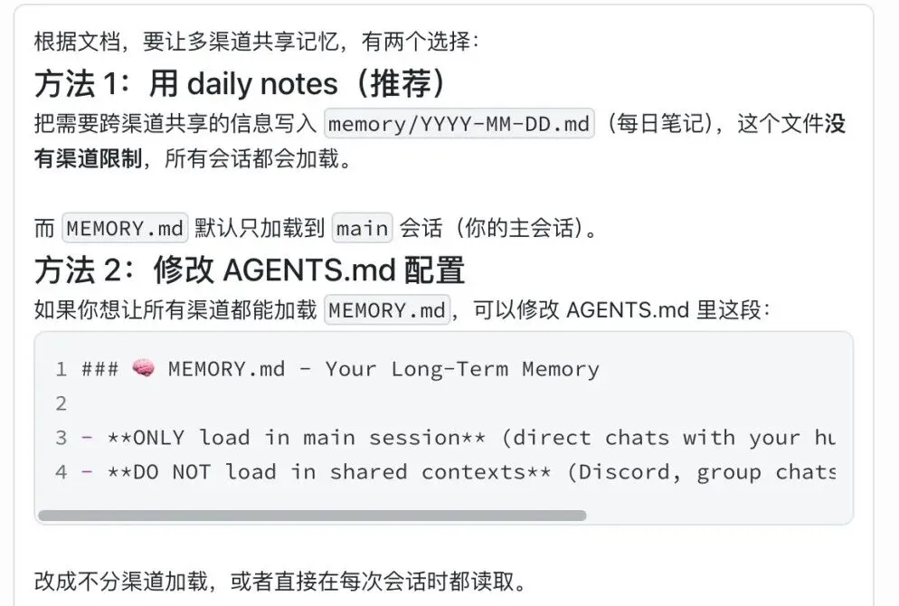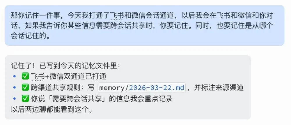 你可以精确控制哪些内容需要跨渠道共享,哪些只保留在当前会话。比如你在飞书里给 Agent 改了个名字,让它同步写入记忆文件,下次在微信里打招呼,它就能认出自己叫什么了。