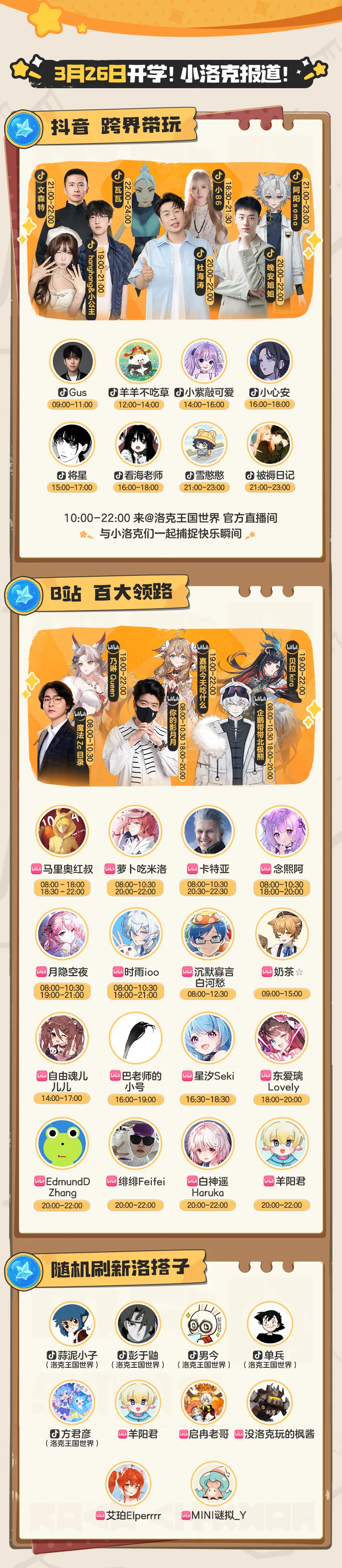 所有小洛克,集结!3月26日至3月31日,我们还邀请了众多人气主播陪大家一起入学,成为大家游玩《洛克王国:世界》的头号引路人!