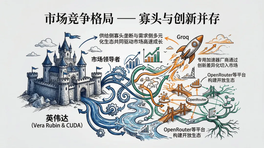 报告核心结论直指 AI 算力 Token 经济呈现多重关键特征,杰文斯悖论在此产业凸显,GPT-3.5 推理成本降幅达 280 倍,但 OpenAI 推理总支出反增 2.4 倍,价格下降引发的需求爆炸成为行业显著趋势;同时劳动力市场出现 K 型极化,AI 产出增长带来幽灵 GDP 现象,劳动收入份额从 60% 降至 45%,资本收入增长率升至 8.0%,而劳动收入仅 0.8%。当前行业核心现状表现为全球算力基础设施呈寡头垄断与创新并存格局,英伟达占据核心地位,2025 财年数据中心营收达 1152 亿美元、占总营收 88.3%,CUDA 生态 600 万开发者形成强锁定效应;全球 AI 算力竞争已上升至地缘政治层面,算力与能源成为主权国家核心战略资源,美国实施芯片出口管制,中国推进国产替代,2026 年中国 AI 加速芯片市场预计达 3813.9 亿元,年增超 58%,已建成 42 个万卡级智算集群。产业端,Token 价值链涵盖硬件制造、基础设施建设等五大环节,OpenRouter 平台 3 年 Token 处理量增长 10 倍,全球 2026 年 AI 支出预计达 2.52 万亿美元,同比增 44%,但算力扩张面临能源瓶颈,2030 年全球数据中心电力需求较 2025 年增幅将达 84.7%。